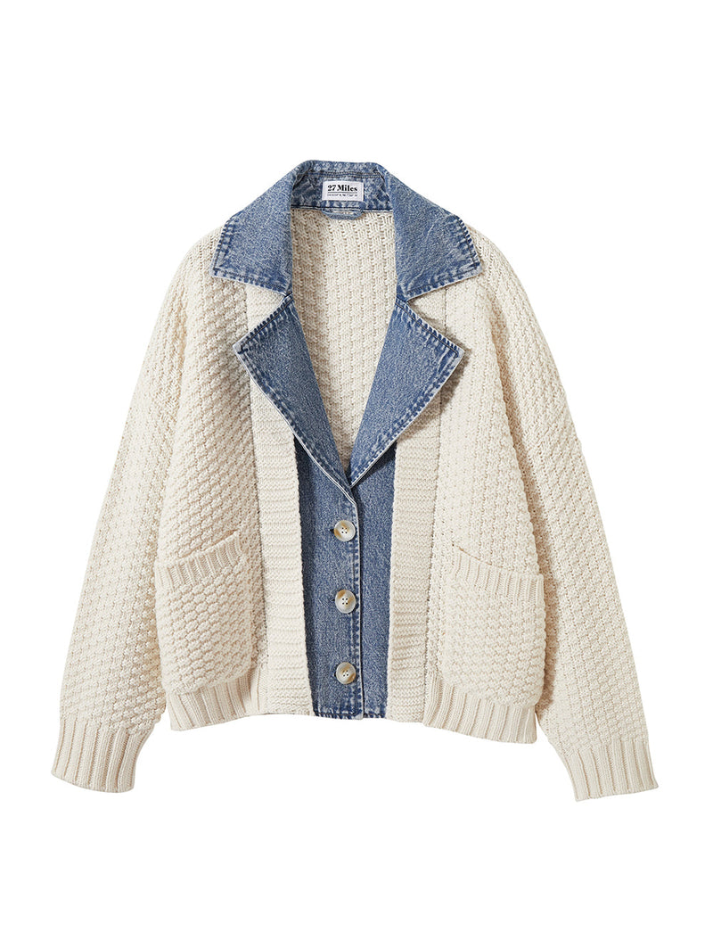 Embrace contrasting textures with Baille, a chunky, structured cardigan with a denim collar that's sure to elevate your style.