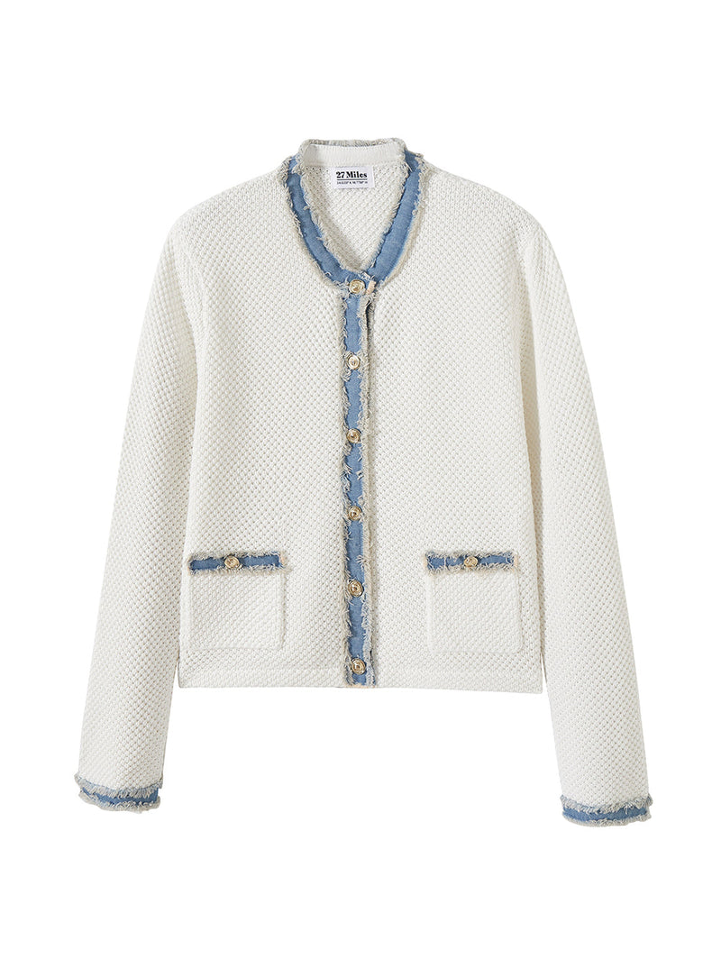 Sutton is where classic meets cool. This timeless lady cardigan gets a fresh update with textured cotton stitches and frayed denim trims, striking the perfect balance between polished and laid-back. It's effortless yet refined, making it the kind of piece you can throw on with anything—whether you're dressing up or keeping it casual.