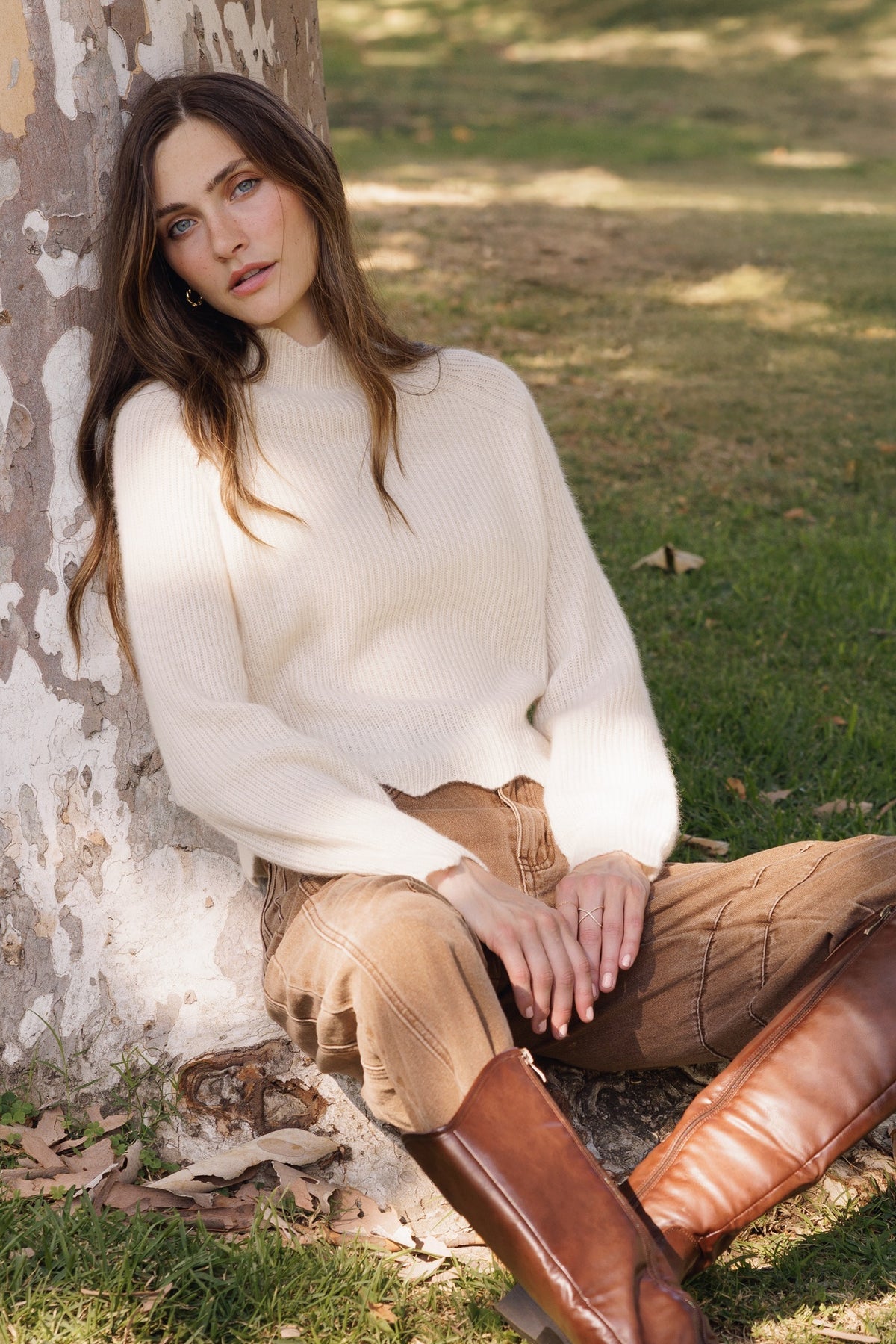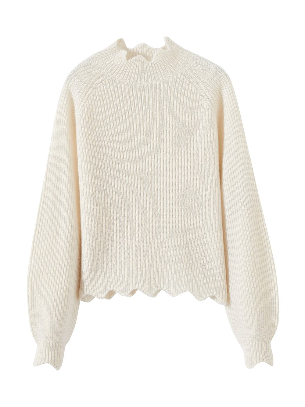 Feather-light and ultra-soft in silk cashmere, this sweater features a straight fit with subtle lantern sleeves. Scalloped edges at the neckline, cuffs, and hem add a delicate touch. In a soft white hue, it's an effortlessly elegant layer that pairs with everything.