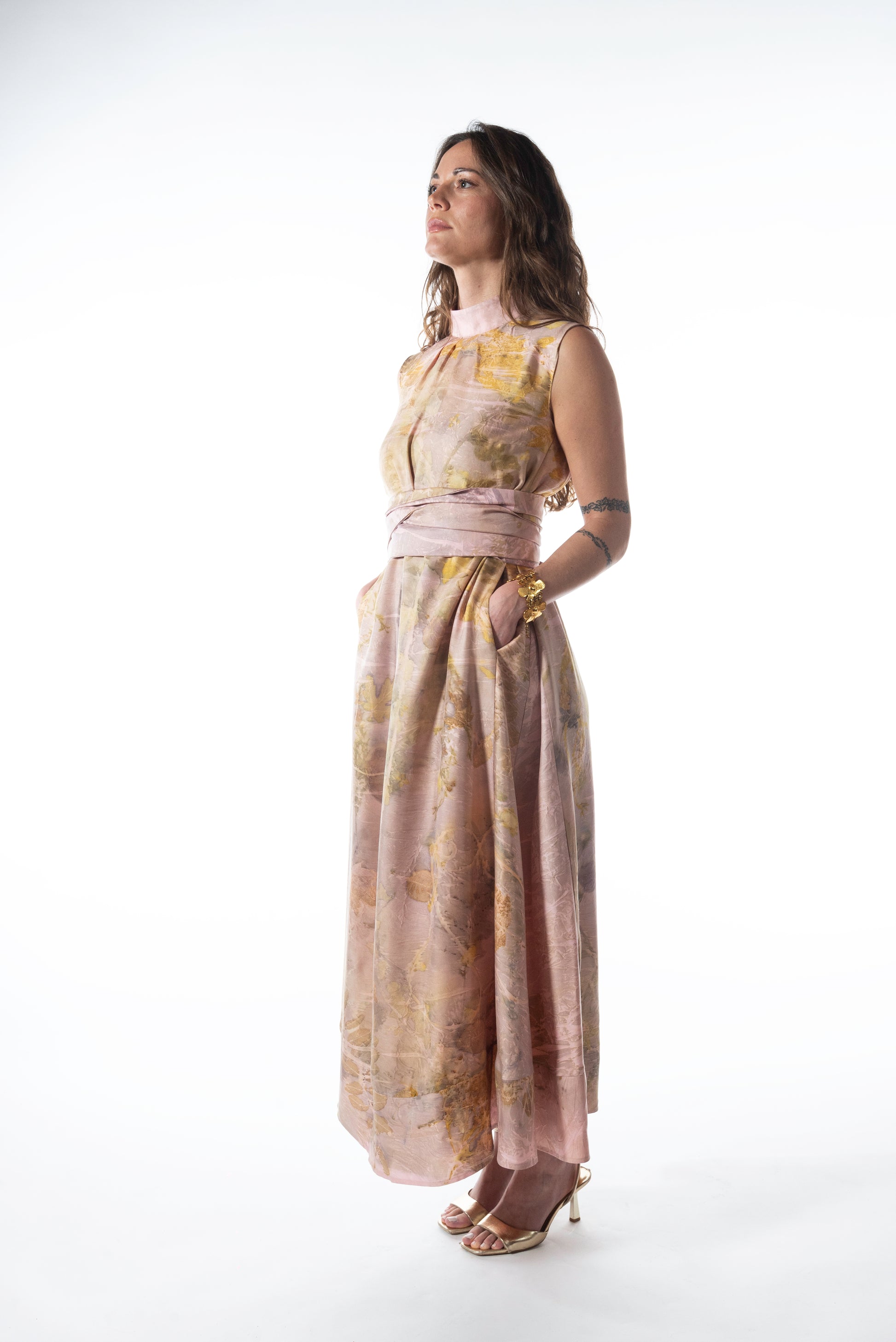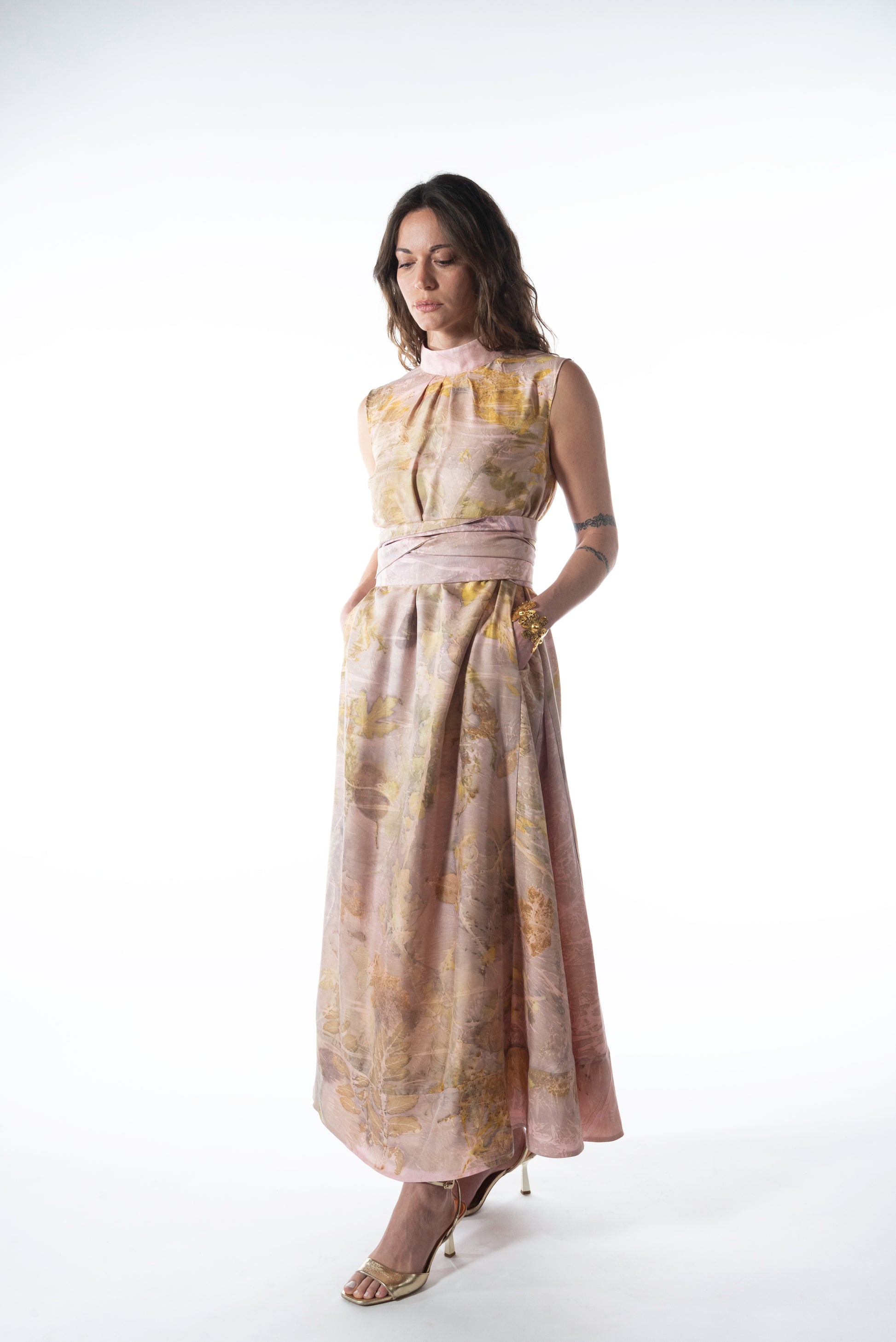 The high neckline with a soft collar closes at the back with a row of delicate mother-of-pearl buttons. Side pockets add practicality, while the reversible, removable fabric belt allows you to play with the silhouette—cinching at the waist or leaving it loose for a more relaxed look.