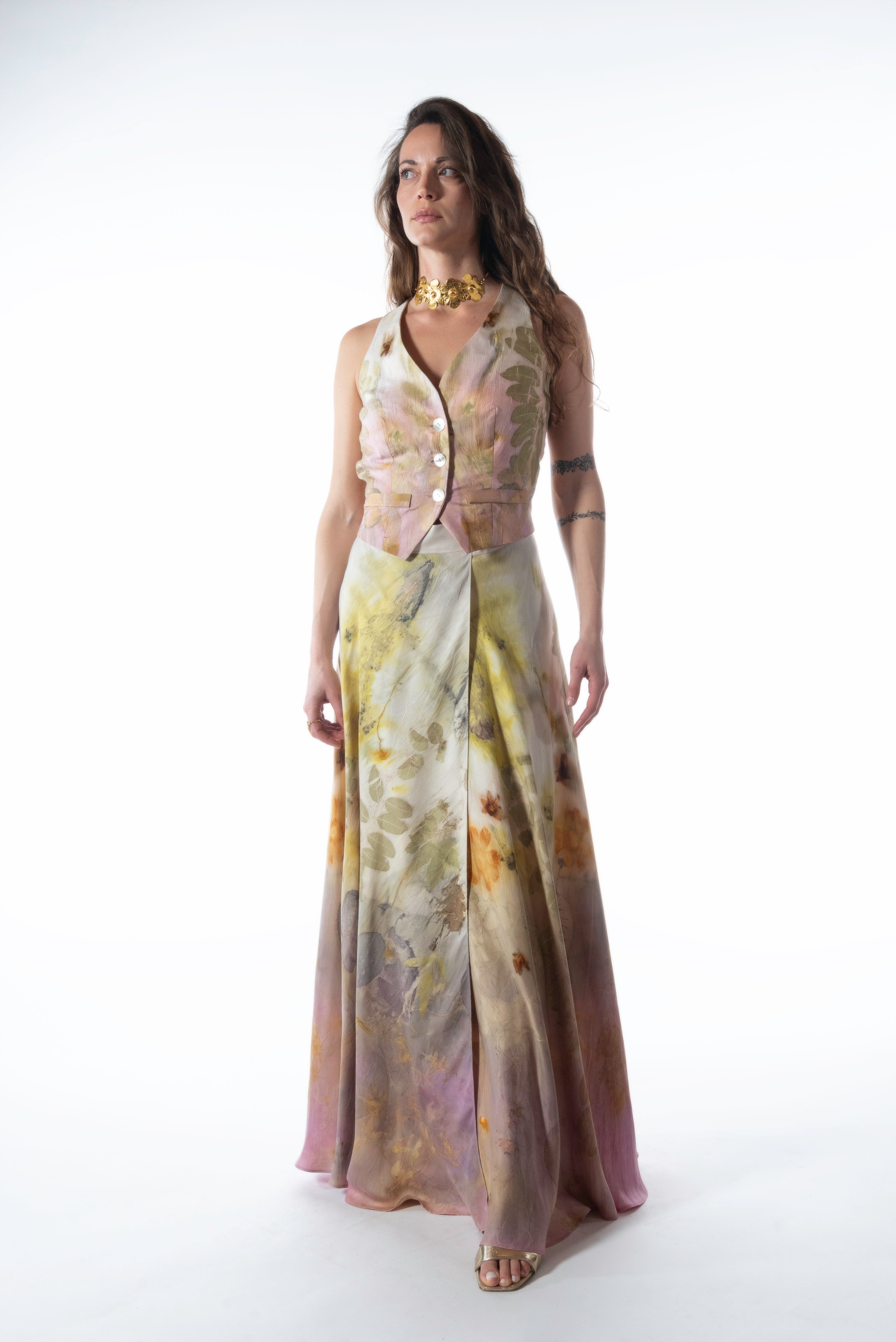 The prints and dyes are artisanally made in Italy using plants, flowers, and roots that, through a natural process, permanently imprint their color and shape onto the fabric. Each piece is one-of-a-kind and unrepeatable—an exclusive, sustainable creation.