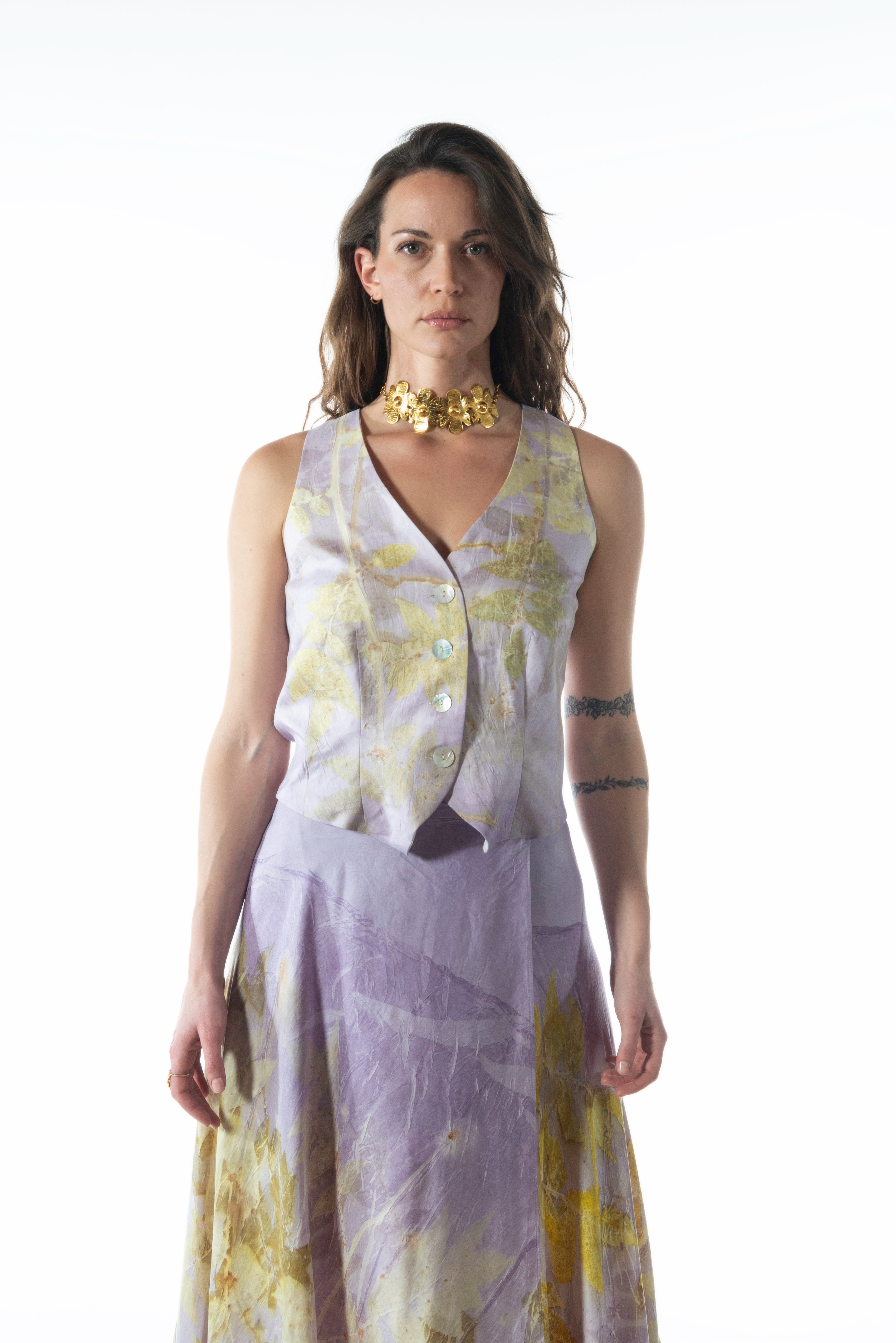 A classic-cut vest in 100% silk, featuring a front closure with natural mother-of-pearl buttons. Designed to be paired with the Petra Skirt or layered over tops and lightweight dresses.