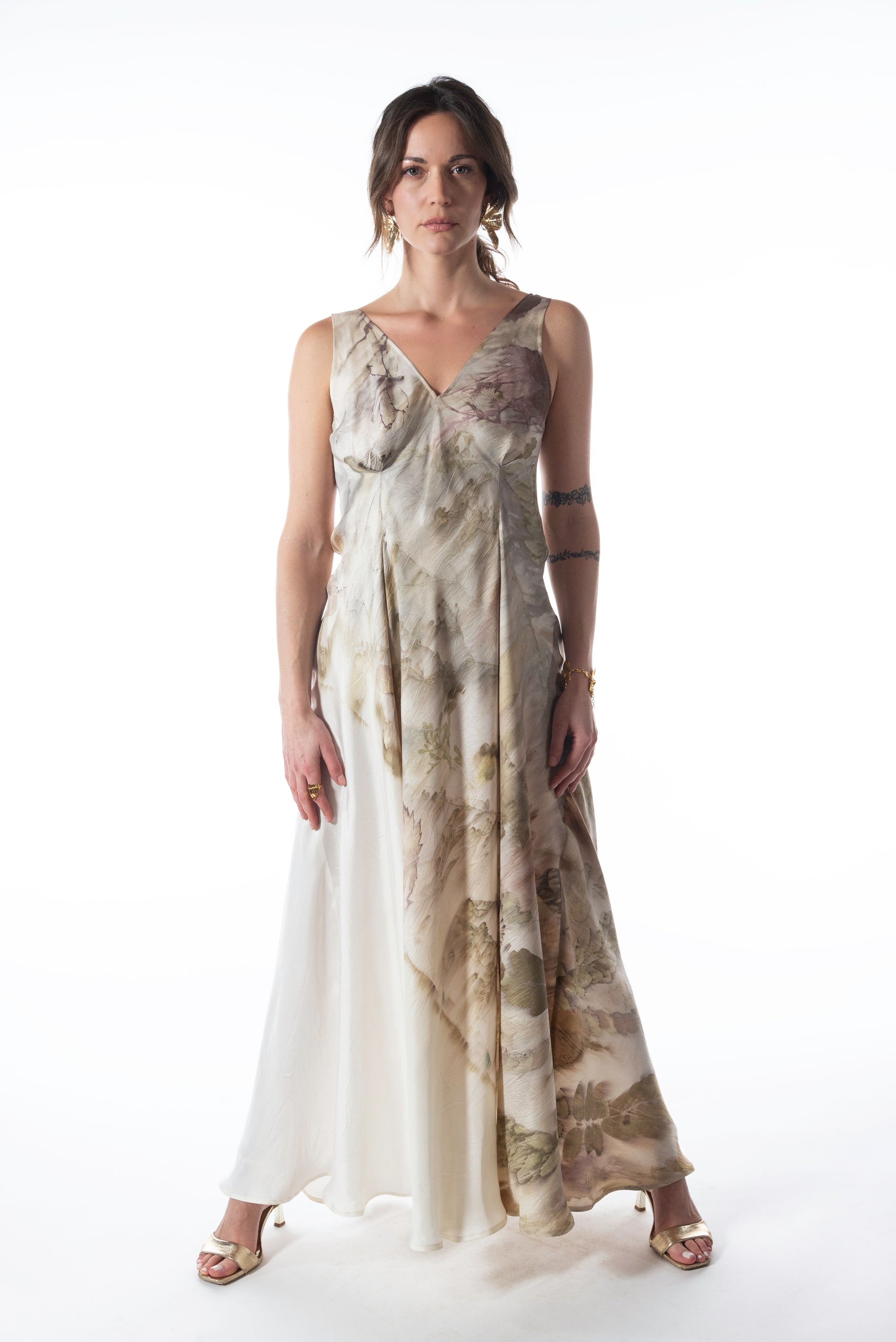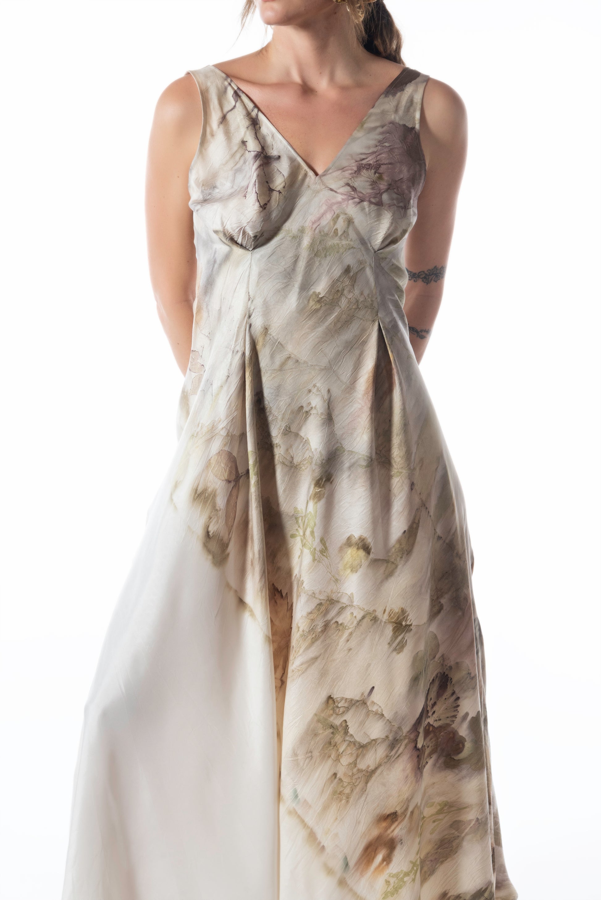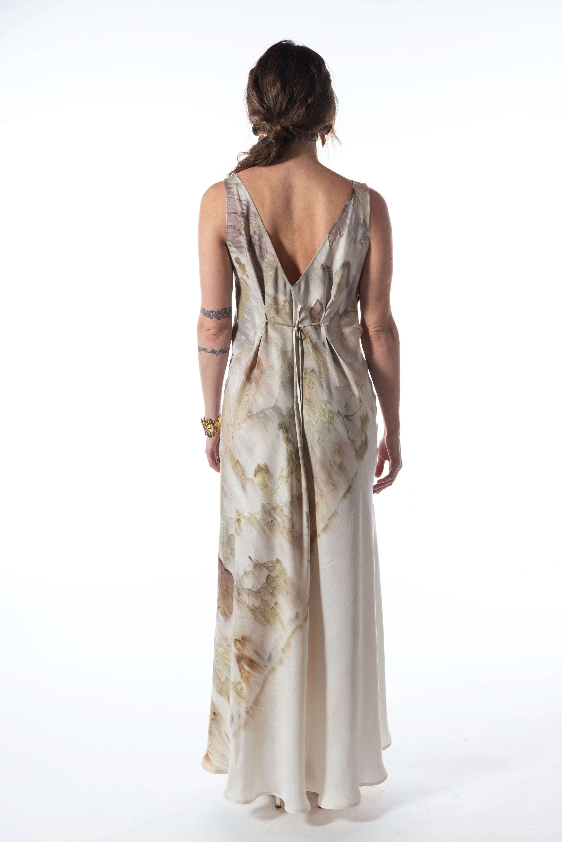 Elegant and fluid, the Sara Dress is an A-line dress made from delicate 100% silk twill, designed to drape gently over the body with ease and grace. The deep V-neckline at both the front and back adds femininity and balance, while the adjustable ties at the back allow for a customized fit.