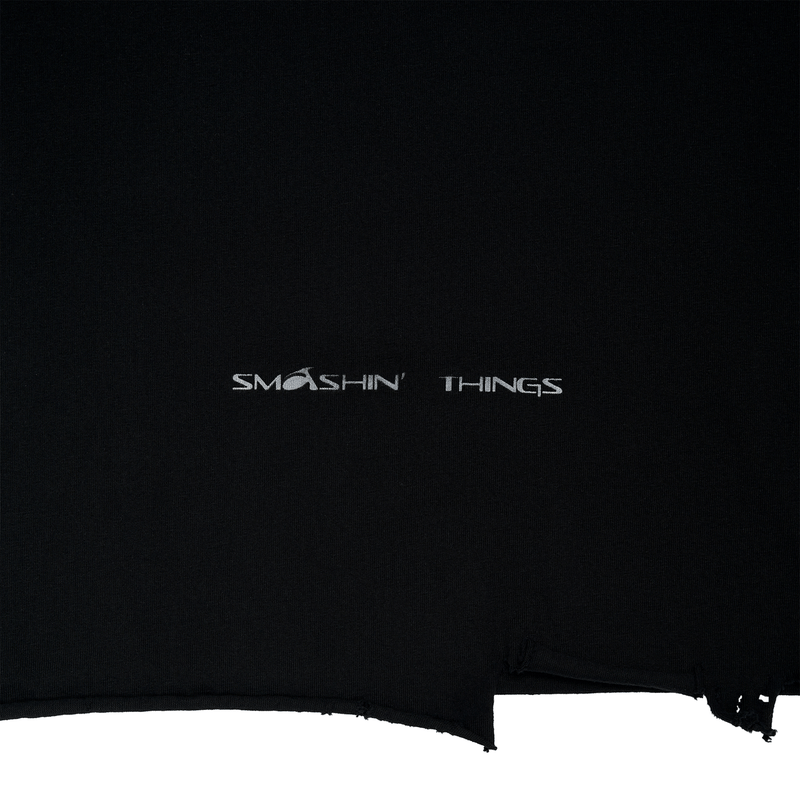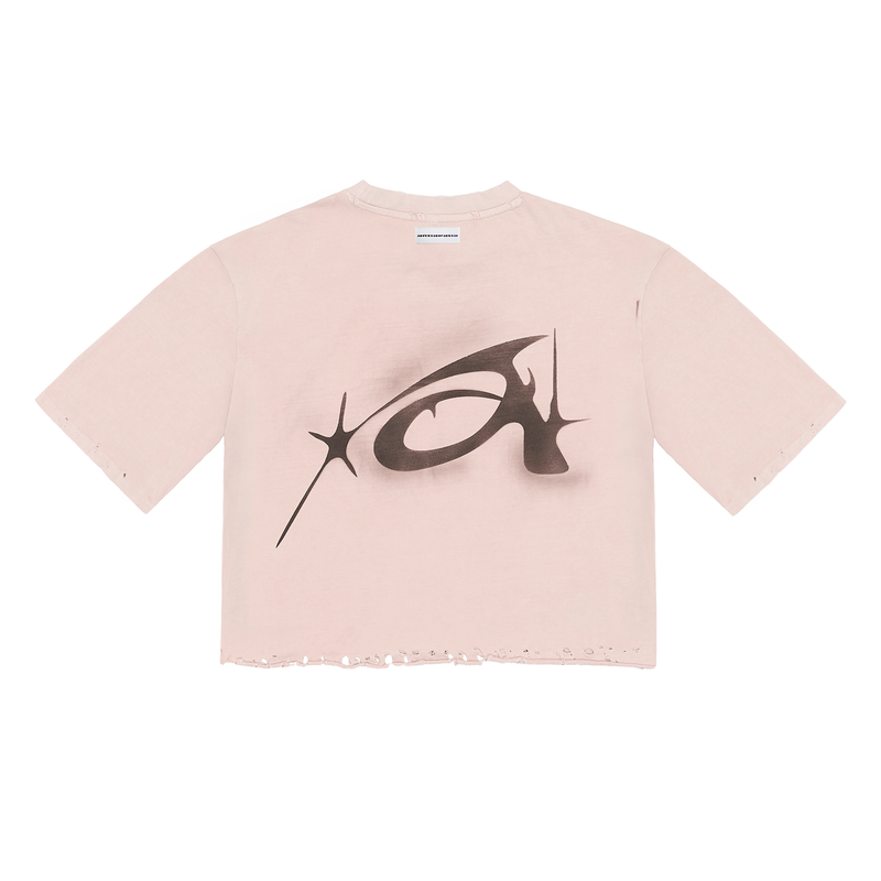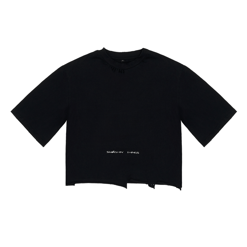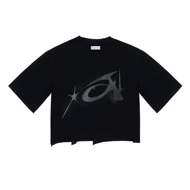 It's an oversized cropped dirty black printed t-shirt, dirty wash, ripped. Handcrafted in Italy.