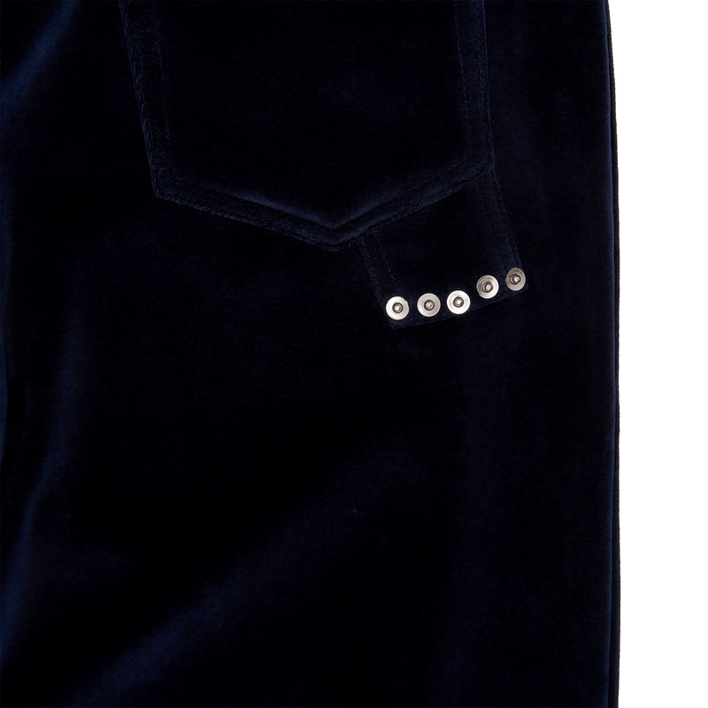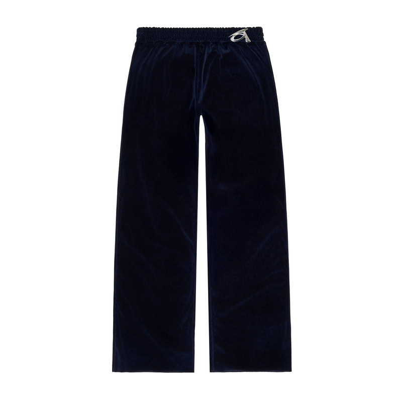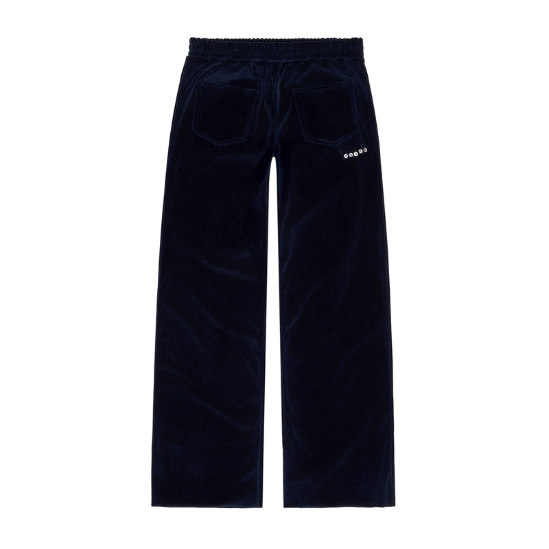 It's a baggy chenille sweatpants, two big pockets on front, unisex, low waste with an metal logo accessory.