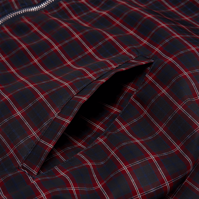 It's a sweatshirt jacket, oversized fit, cropped, long sleeves. Tartan texture with an metal logo accessory.