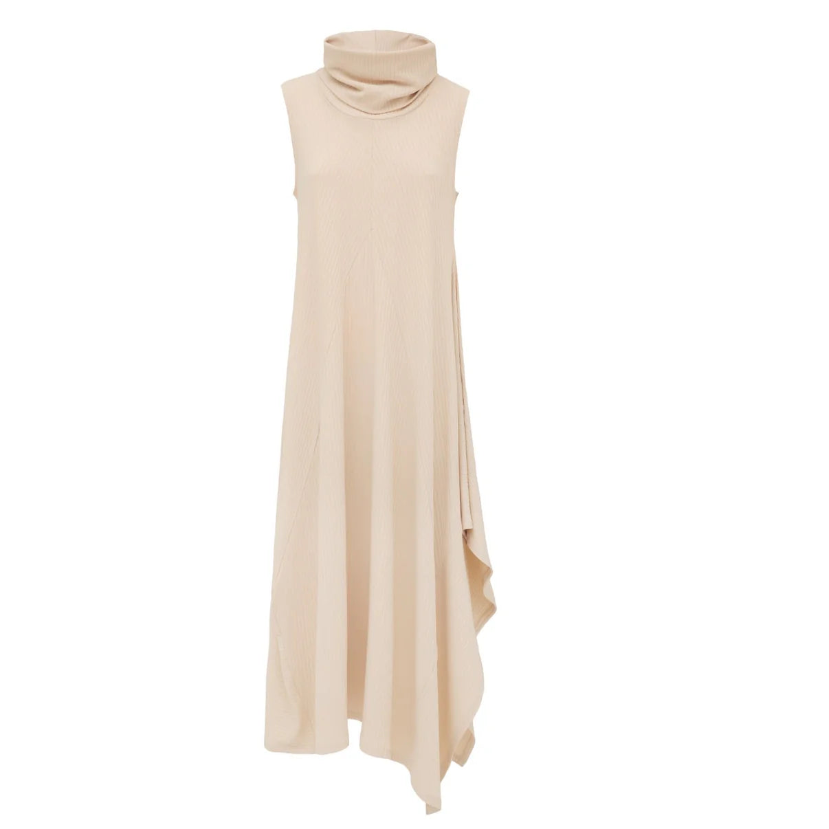 Introduce a touch of sophistication and contemporary elegance to your wardrobe with our Asymmetrical Sleeveless Long Dress in a neutral beige shade. This dress is beautifully crafted from high-quality 'noodle' knit fabric, renowned for its softness, comfort, and ease of maintenance. Ideal for a variety of everyday activities, this dress is also perfectly suited for more special occasions, making it a versatile addition to your wardrobe.