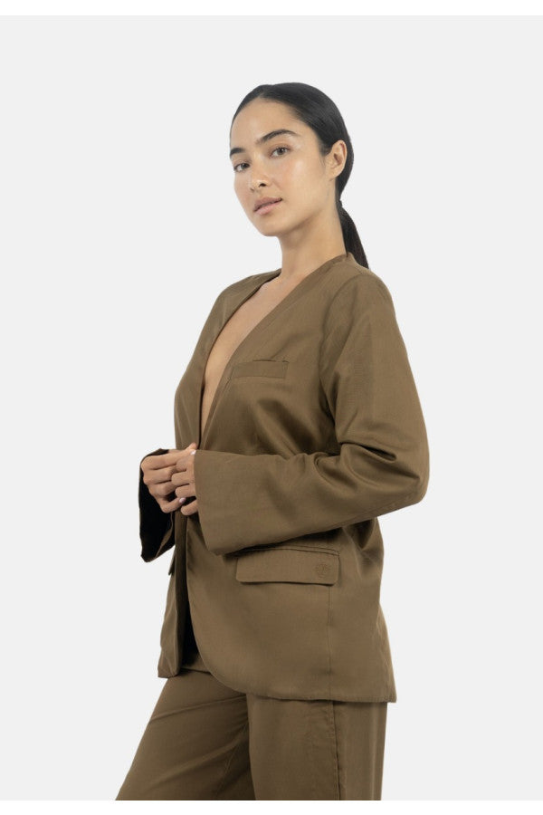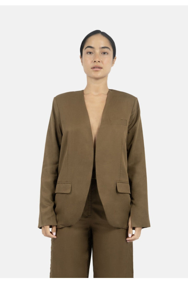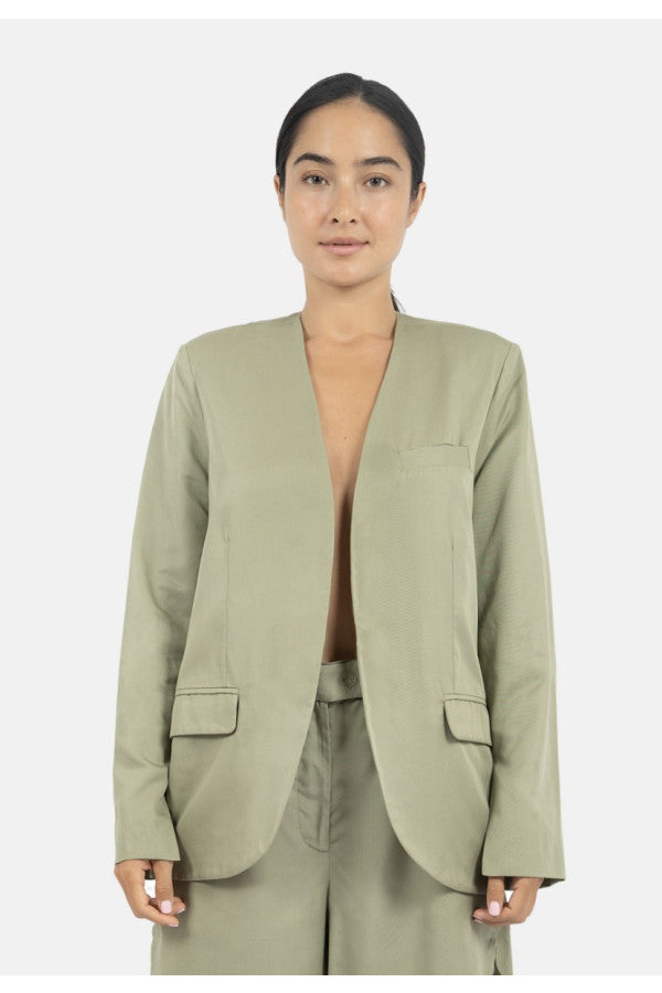 The staple blazer to have in your wardrobe, with a classic, slightly boxy silhouette, and with very light shoulder pads. You can look laidback in a refined way due to its minimalistic expression, flaunting a collarless blazer with chest and side pockets for style and function. Wear a size up for an oversized look.