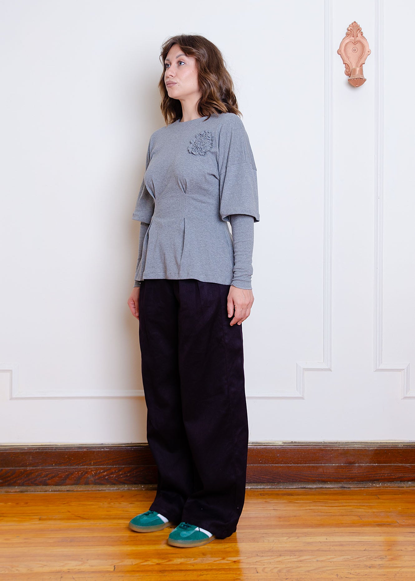 Grey heather hip-length knit top with fit & flare waist, double layer sleeve & appliqué flower detail at chest.