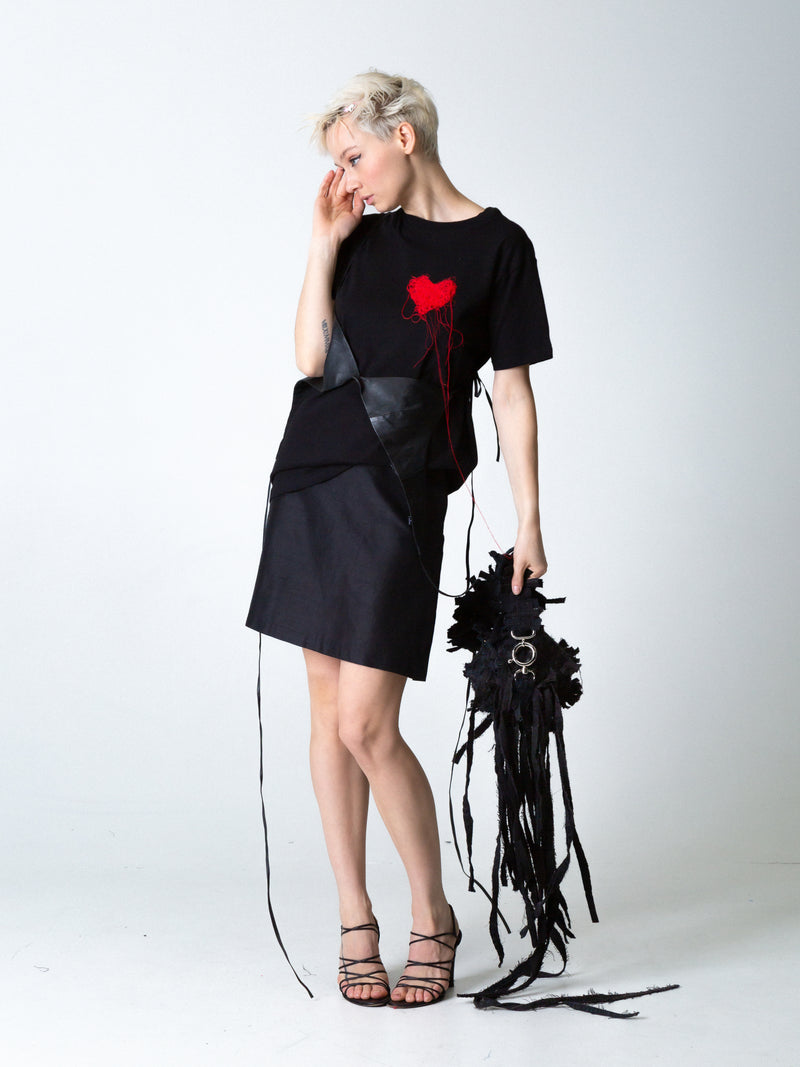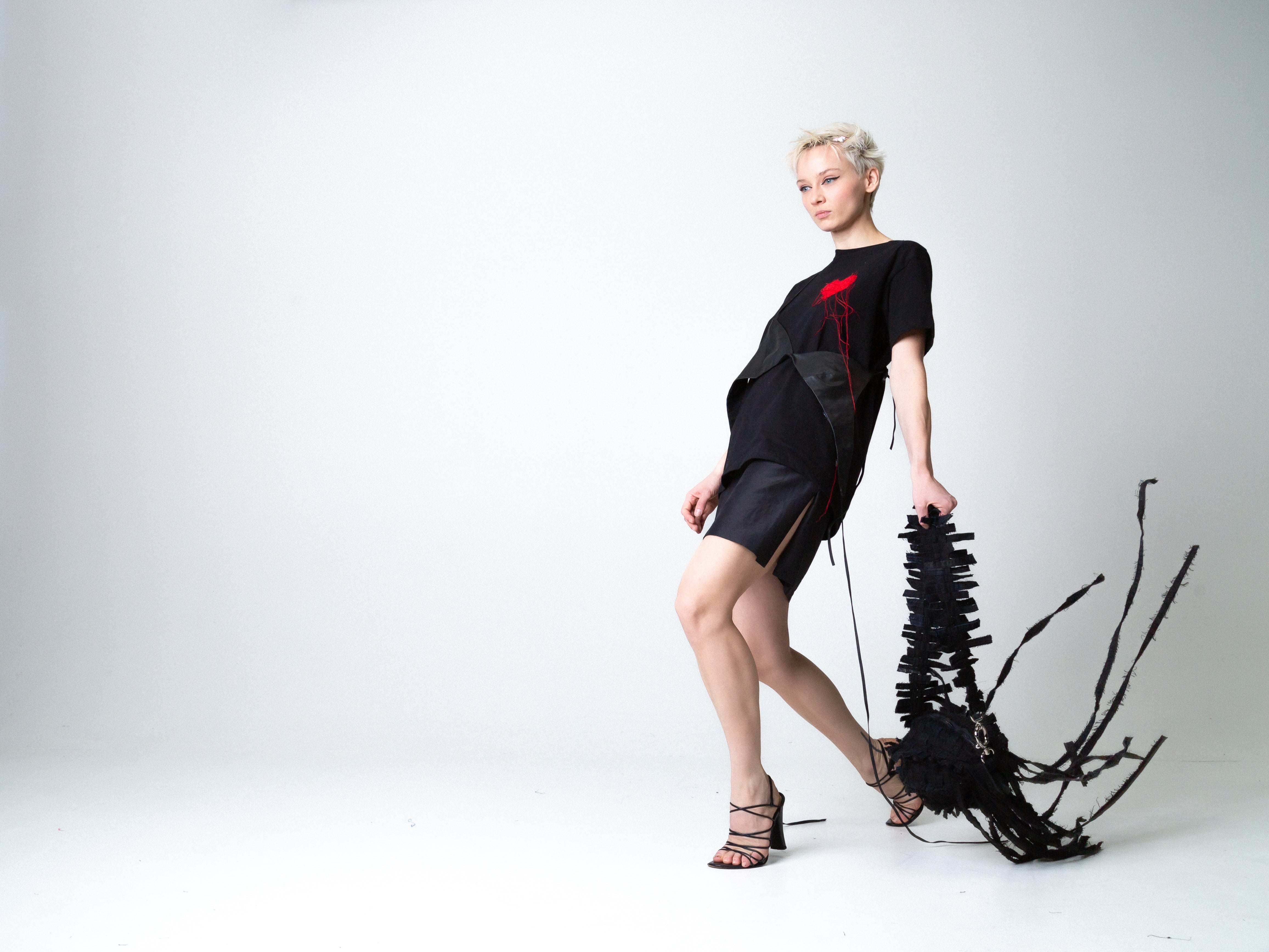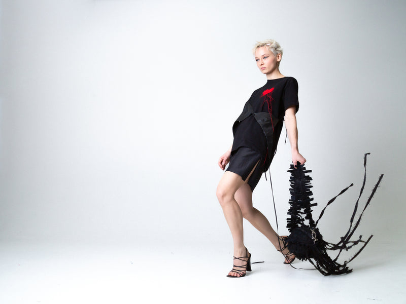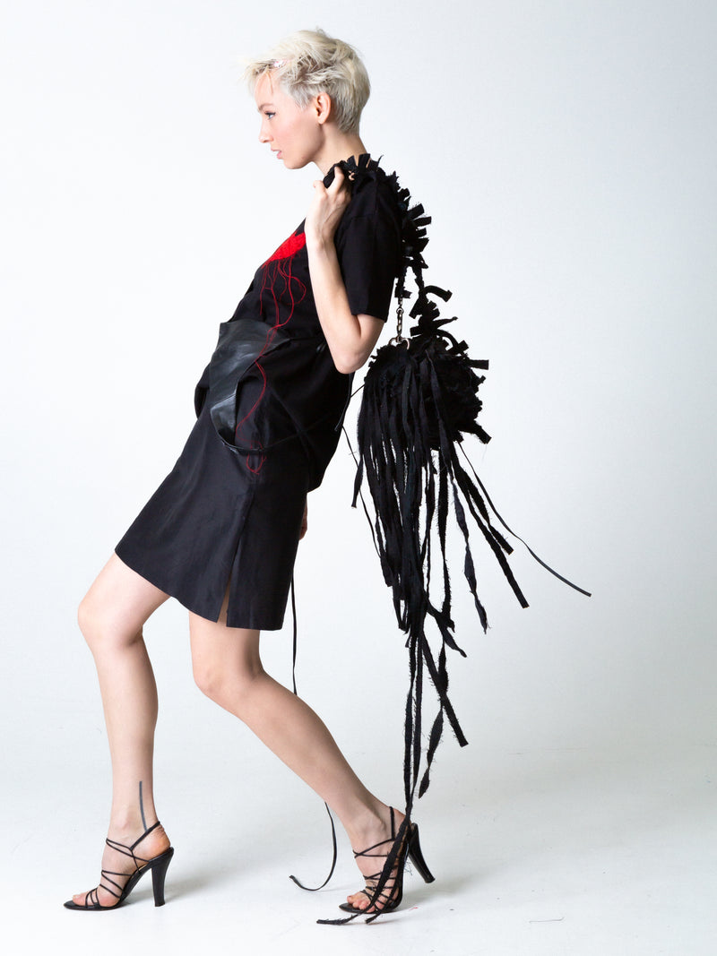 Denim strips are sewn from discarded jeans like long beltloops and woven to create the main material