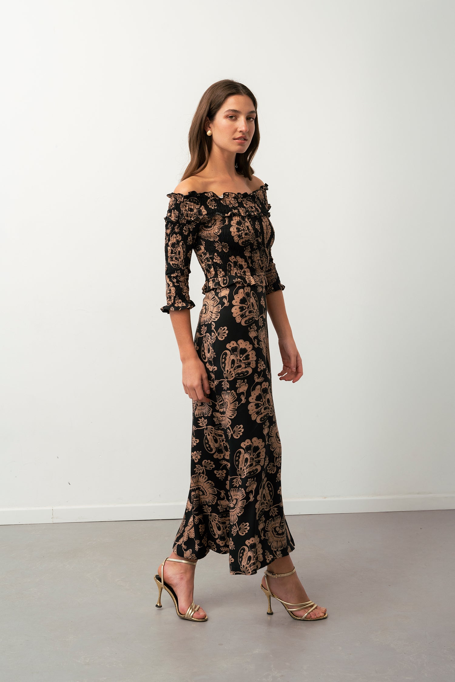 Midi dress in printed fabric with black and camel colors. Gathered Bardot neckline, gathered bodice and midi sleeves. Features a ruffled detail at the end of the gathering and a hidden zipper closure at the back.