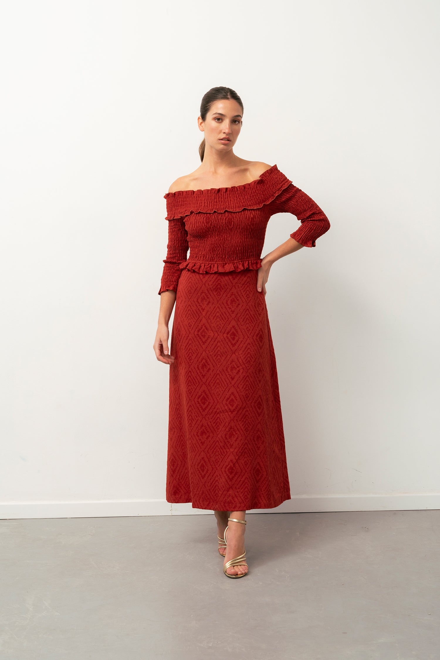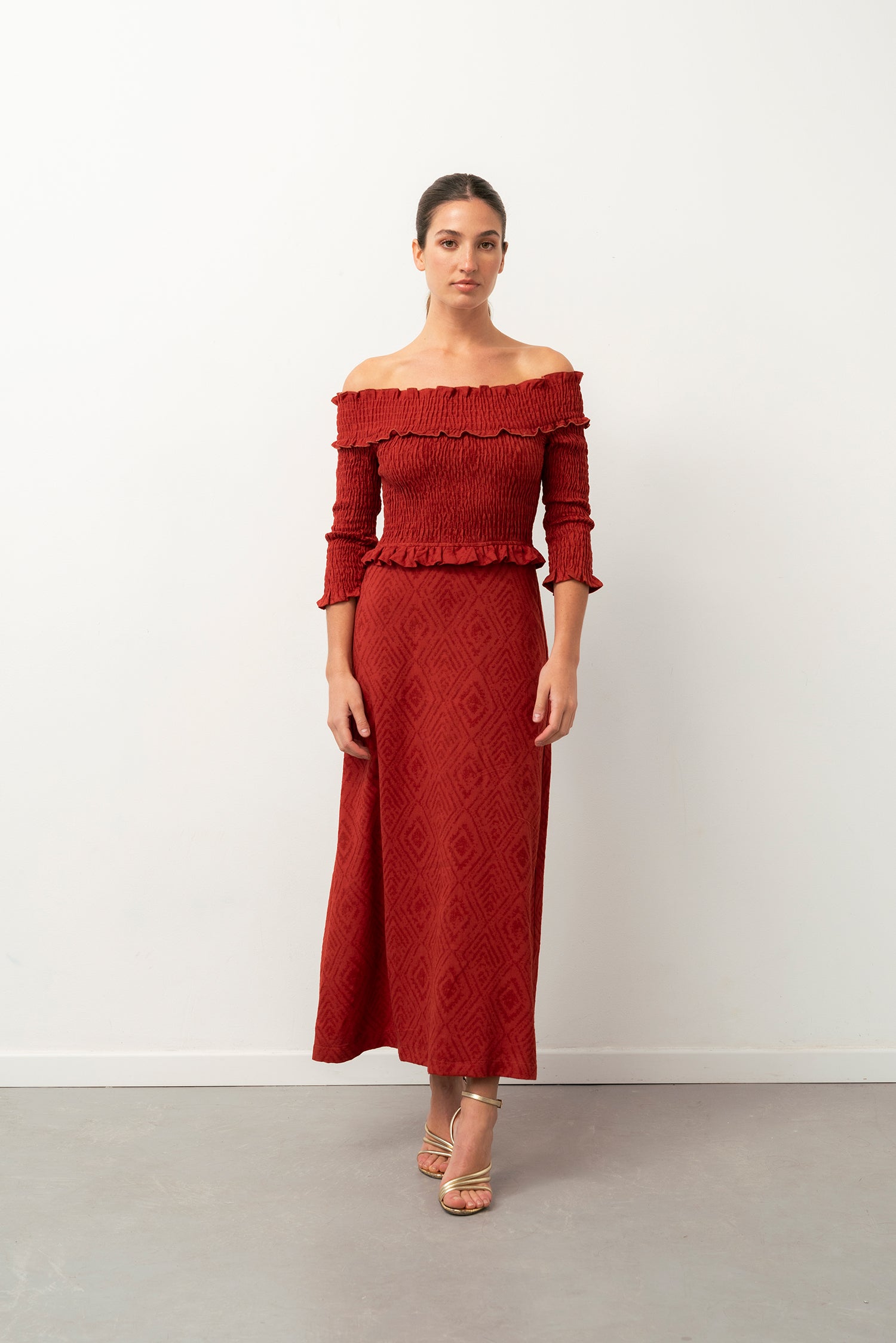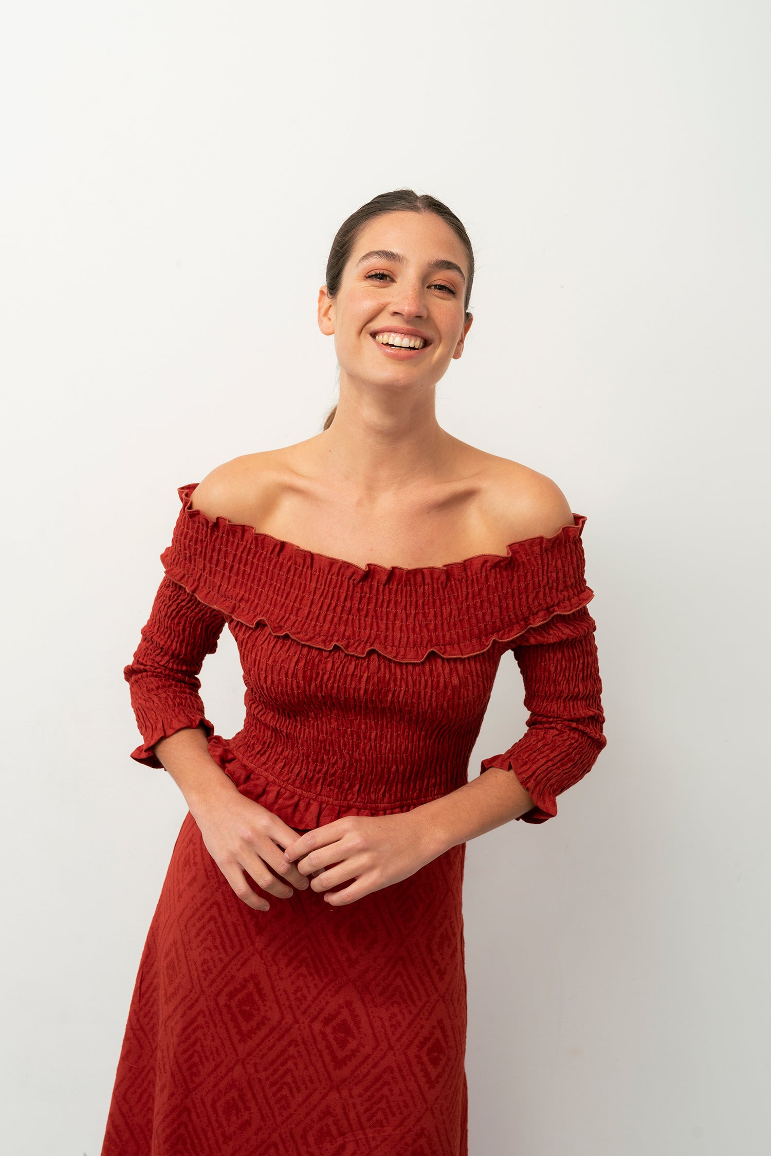 Midi dress in printed fabric with red colors. Gathered Bardot neckline, gathered bodice and midi sleeves. Features a ruffled detail at the end of the gathering and a hidden zipper closure at the back.