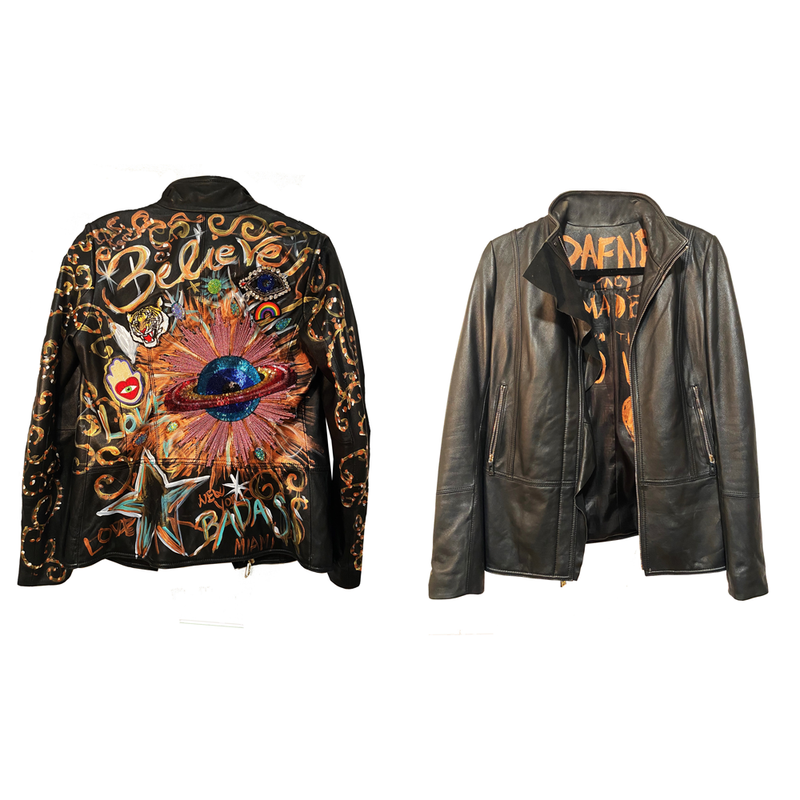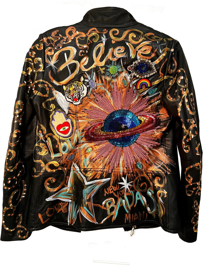 If out of stock, pieces are available upon request: given the hand painted nature of each jacket, slight differences in design are possible.