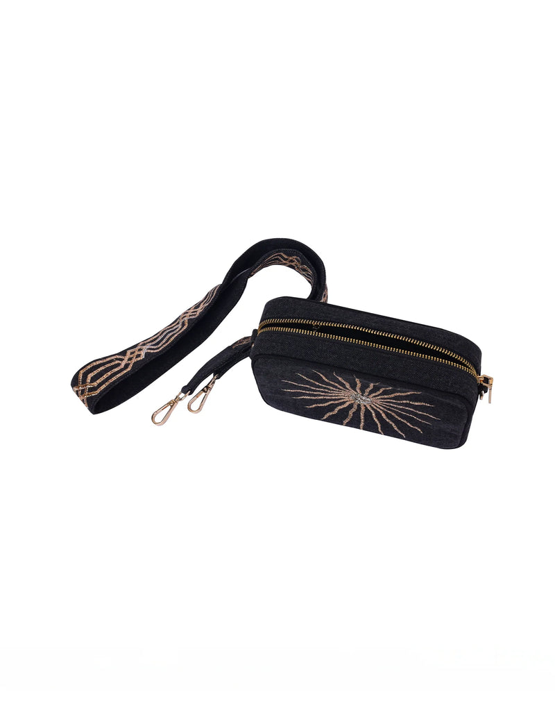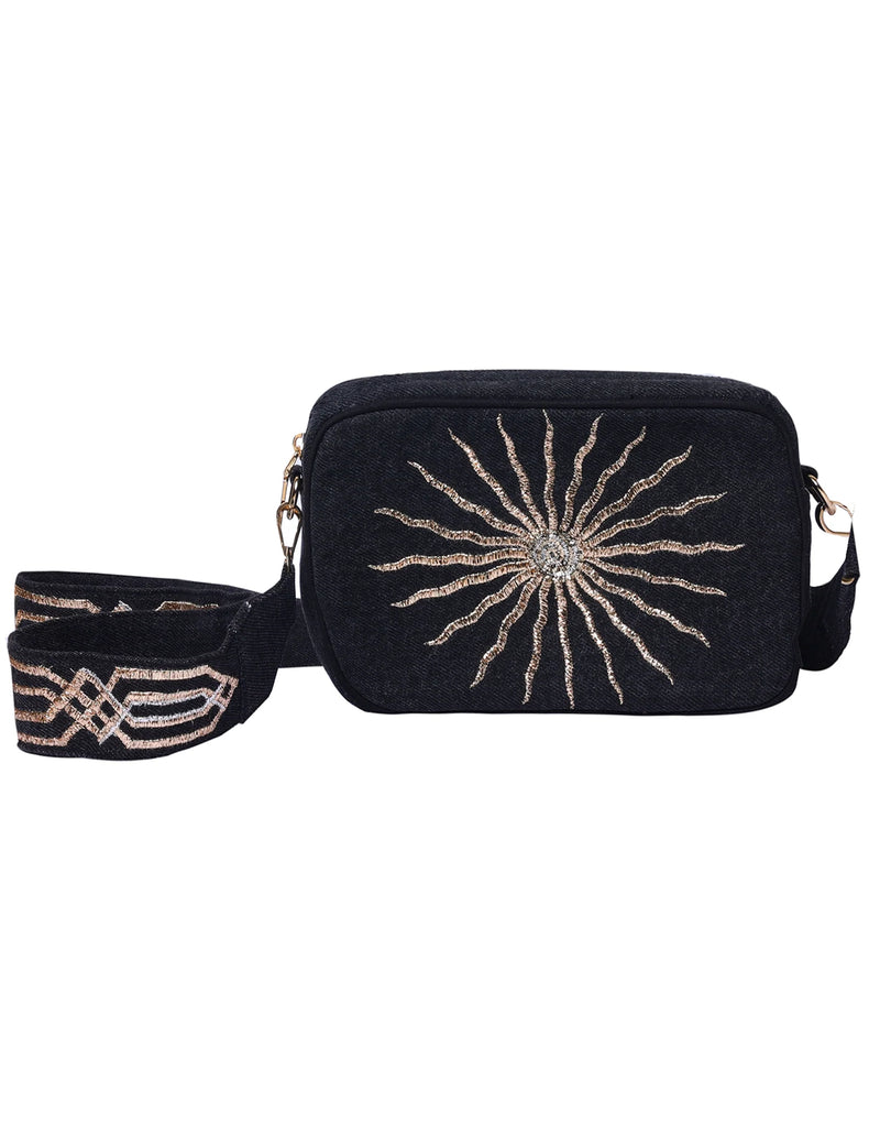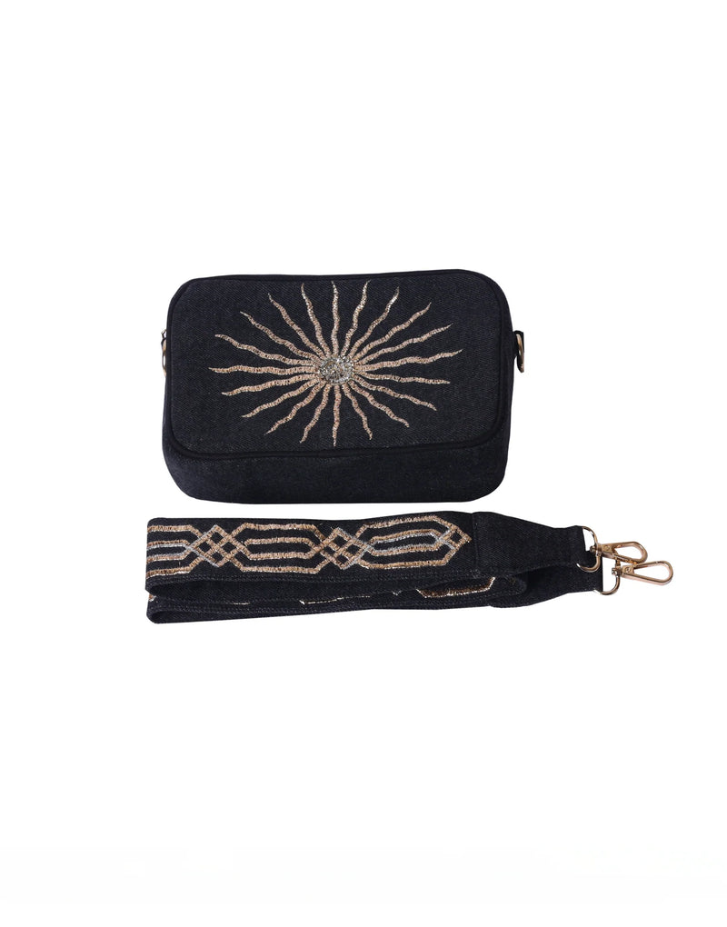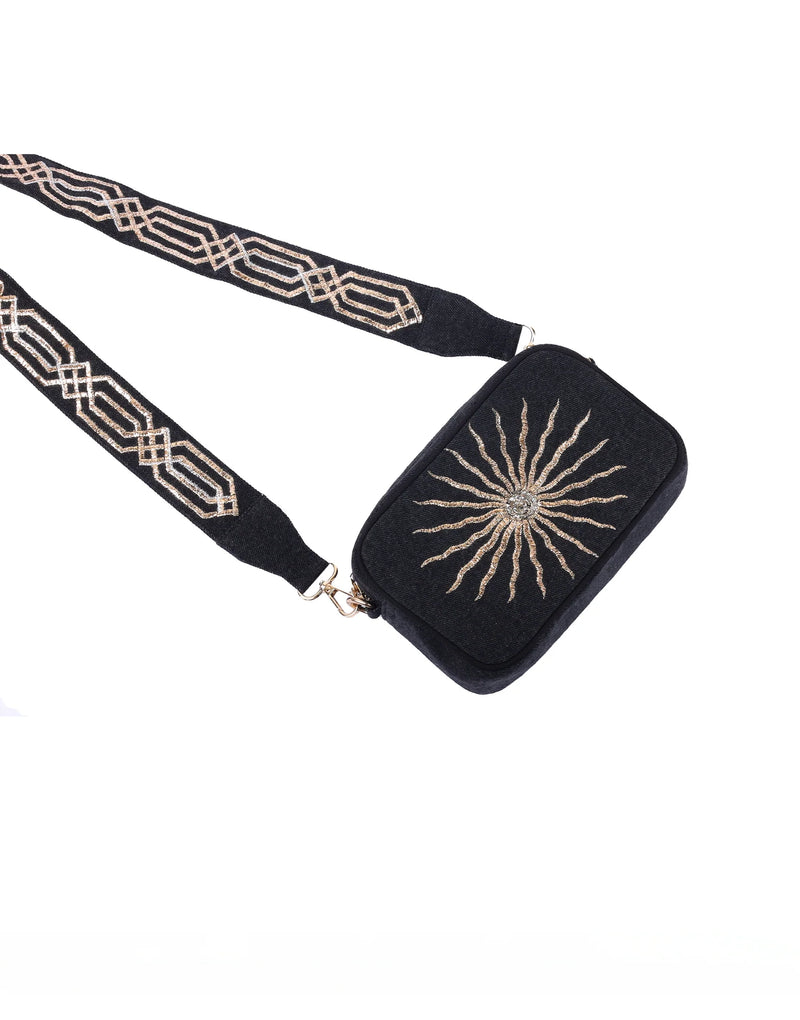 This sleek Black Sun Bag boasts a sturdy black denim base adorned with a shining gold sun embroidery. With its beautifully embroidered strap, this versatile sling bag is the perfect accessory for adding a touch of subtle glamour to any outfit.