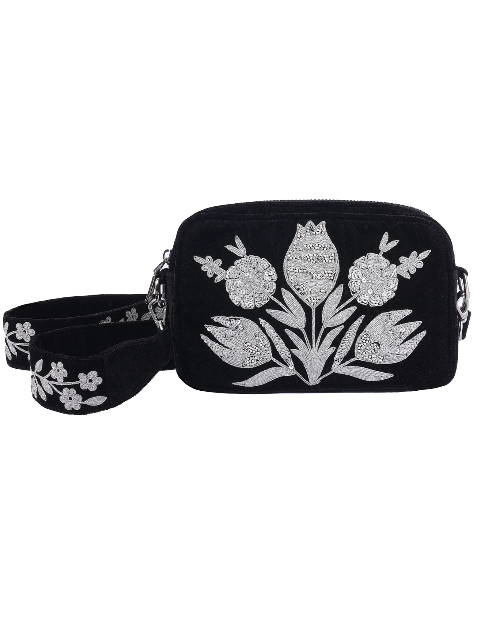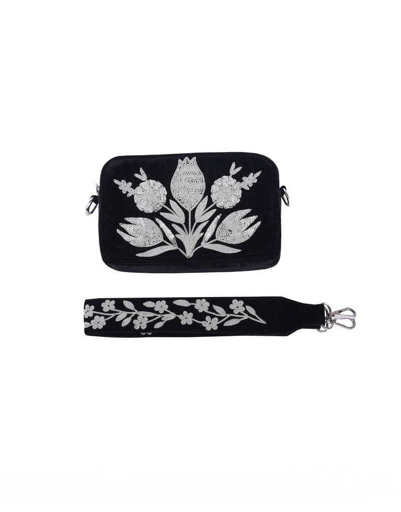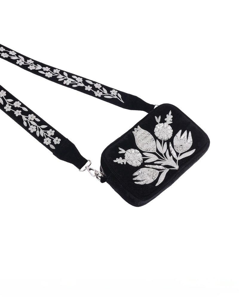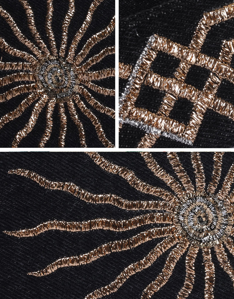 This sleek Black Sun Bag boasts a sturdy black denim base adorned with a shining gold sun embroidery. With its beautifully embroidered strap, this versatile sling bag is the perfect accessory for adding a touch of subtle glamour to any outfit.