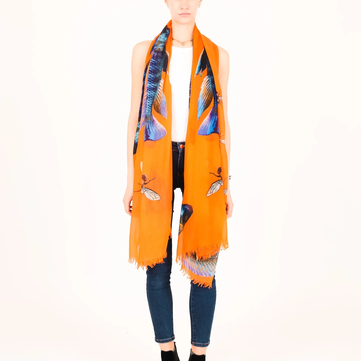 Our colorful printed BUTTERFLY & FISH cashmere scarf in the color gray combines the composition of exotic fish, butterflies and bees. The motif printed on the finest cashmere is timeless and special. It can be worn as a scarf around the neck or as a triangular stole around the shoulder. A real classic!