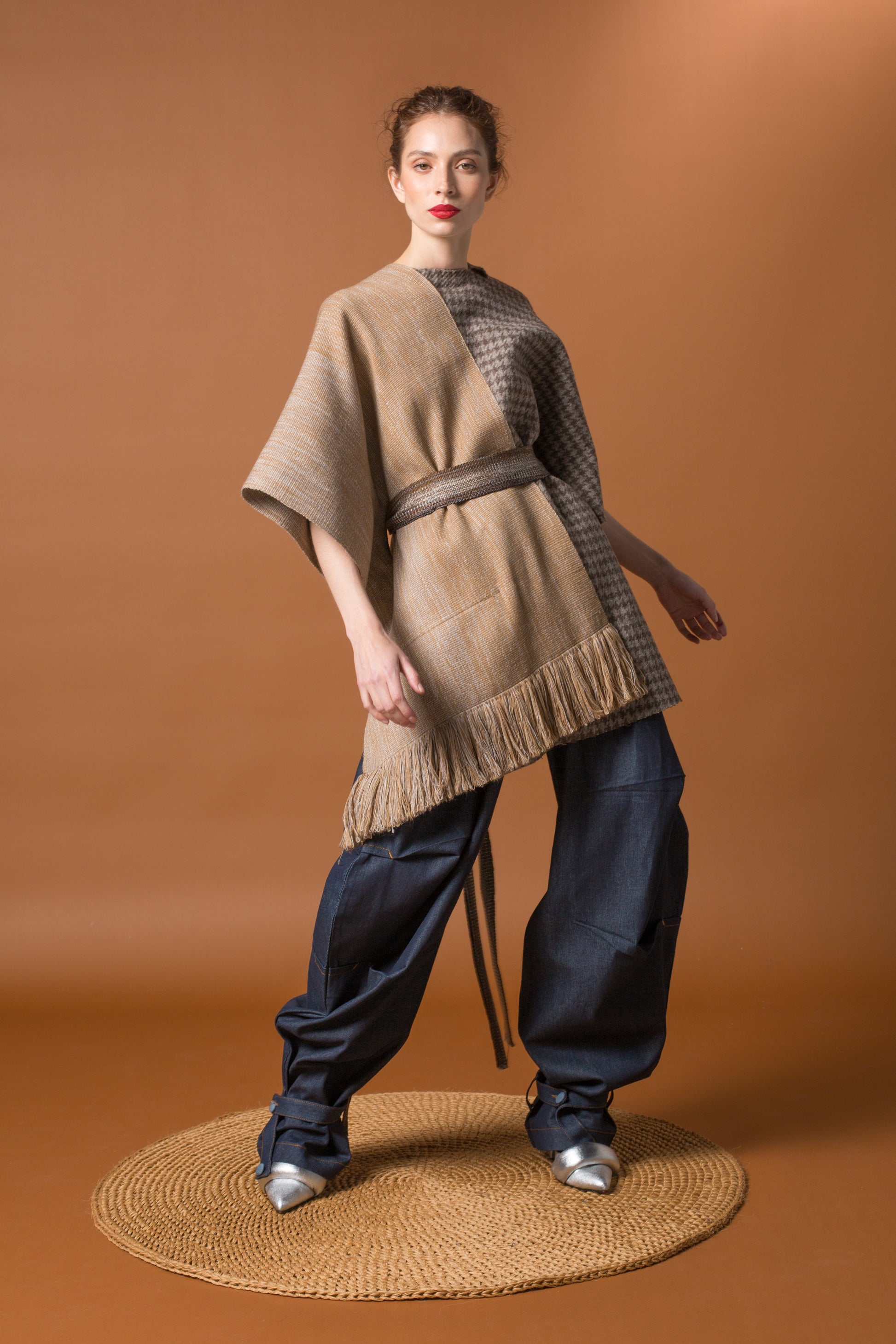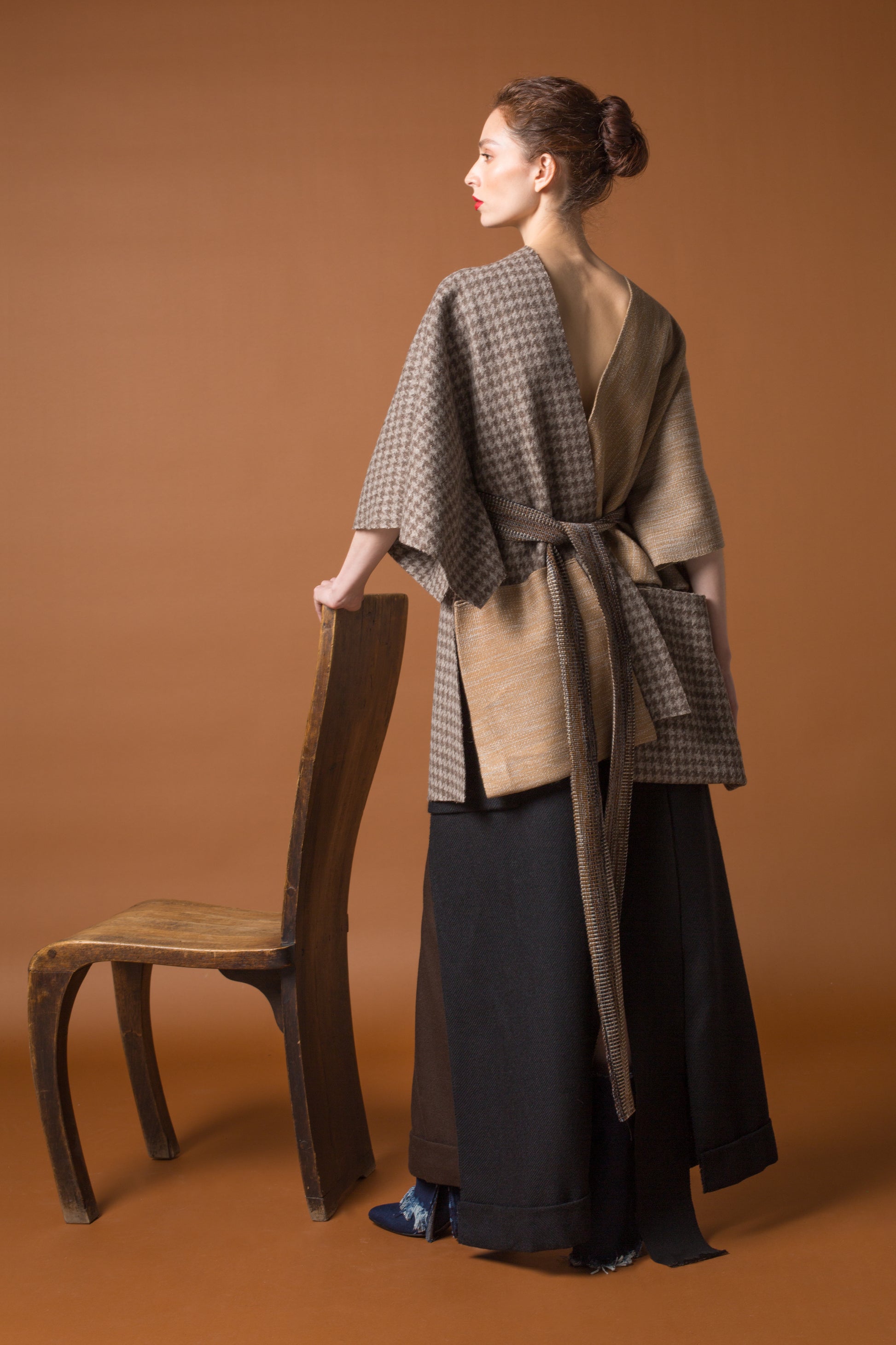 Crafted from handwoven fragments using both vertical and horizontal looms. Features large pleated patch pockets and hand-stitched side buttonholes. Includes an internal loop on the left side, allowing the belt to be passed through the inside for a clean, adjustable fit. Hand-finished for a refined, artisanal feel.