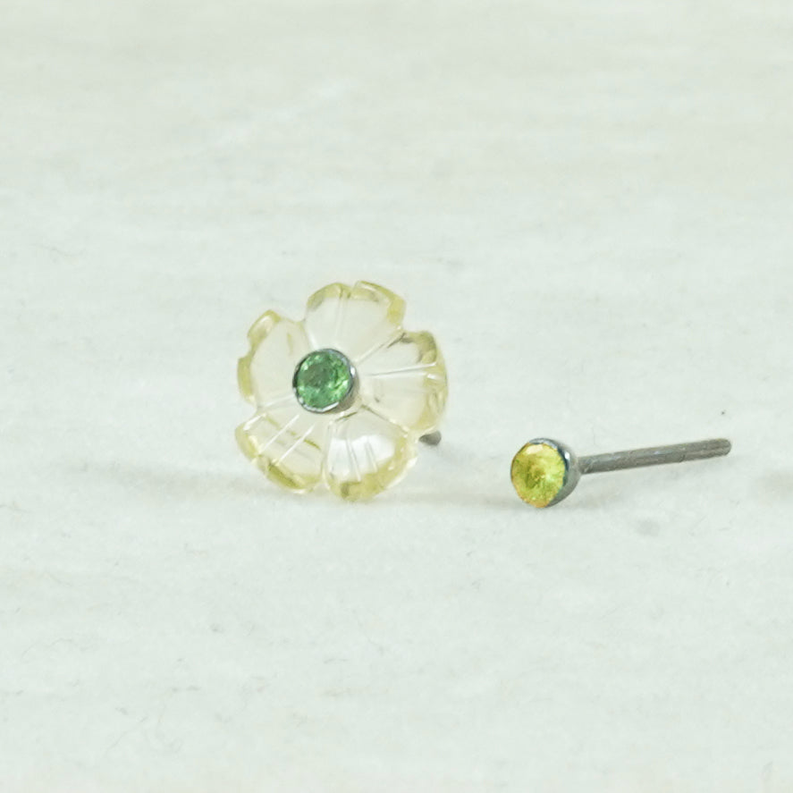 These stunning studs feature carved lemon topaz flowers, offering two different looks. You can change the middle part with either a yellow stone or a green stone for two looks.