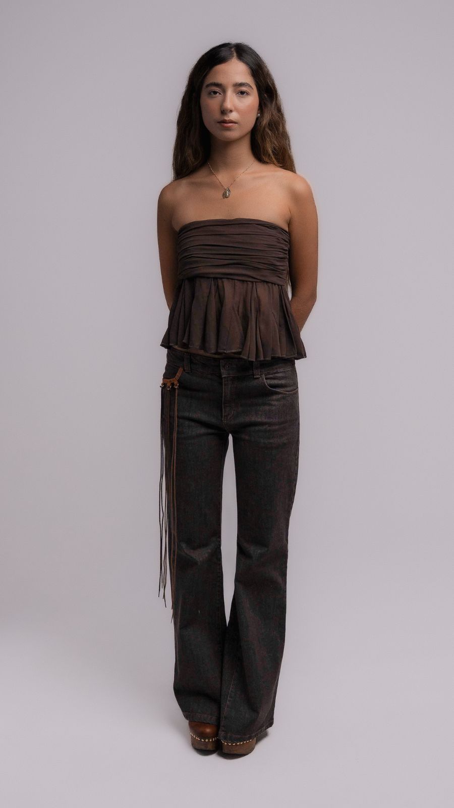 Ruched strapless top in toasted brown with a flowy hem, made from a lightweight, breathable fabric for a chic, yet relaxed look.