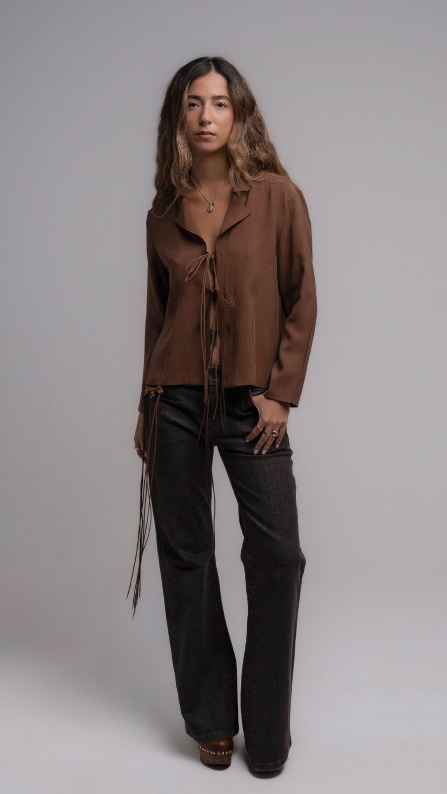 Tie-front brown color blouse detail with a V-neckline and long sleeves, crafted from soft, lightweight fabric for a comfortable fit with a relaxed silhouette, allowing for easy layering.