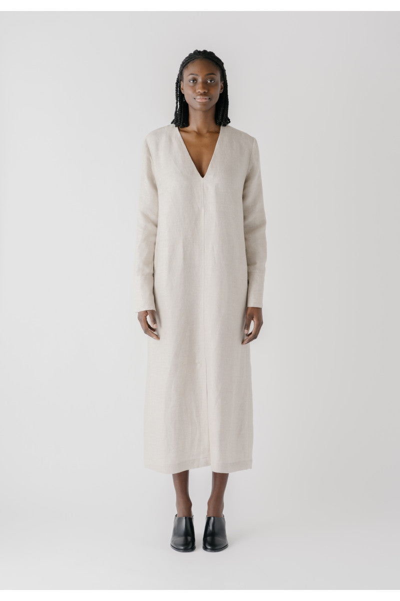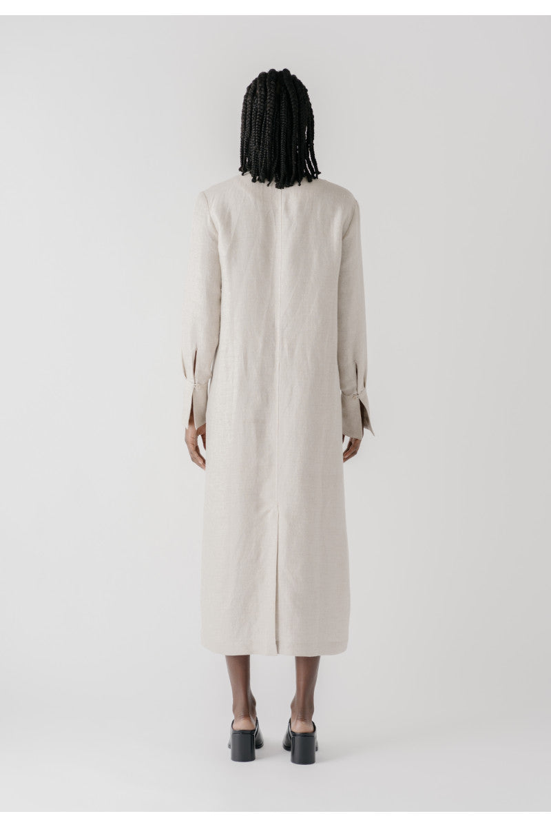 The effortless Casablanca summer dress is a comfortable slip on style inspired by a kaftan silhouette. It’s a midi-length dress with a loose fit and features a low V-neck and integrated pockets in the side seams. The long sleeves have slits, elongated cuffs and are detailed with eco-friendly buttons. There are long vents in front and back for ease of movement. The dress can be styled with a belt for a more defined silhouette.