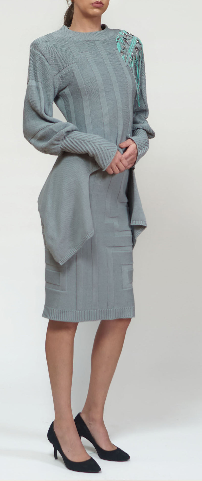 Callisto is shoulder-padded two-piece knitwear with a pencil skirt and handmade embroidery on the shoulder. This outfit combines comfort and sophistication, making it perfect for any stylish occasion. This item pertains only to the skirt.