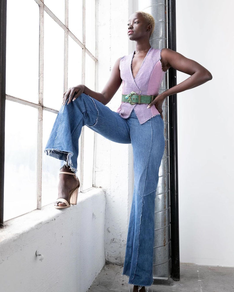 The Cher Jean is a 70s-inspired high-waist flare, cut to make long legs look even longer. Crafted from 100% cotton, upcycled post-consumer denim, each pair features raw-edged detailing and a dramatic, leg-lengthening silhouette.
