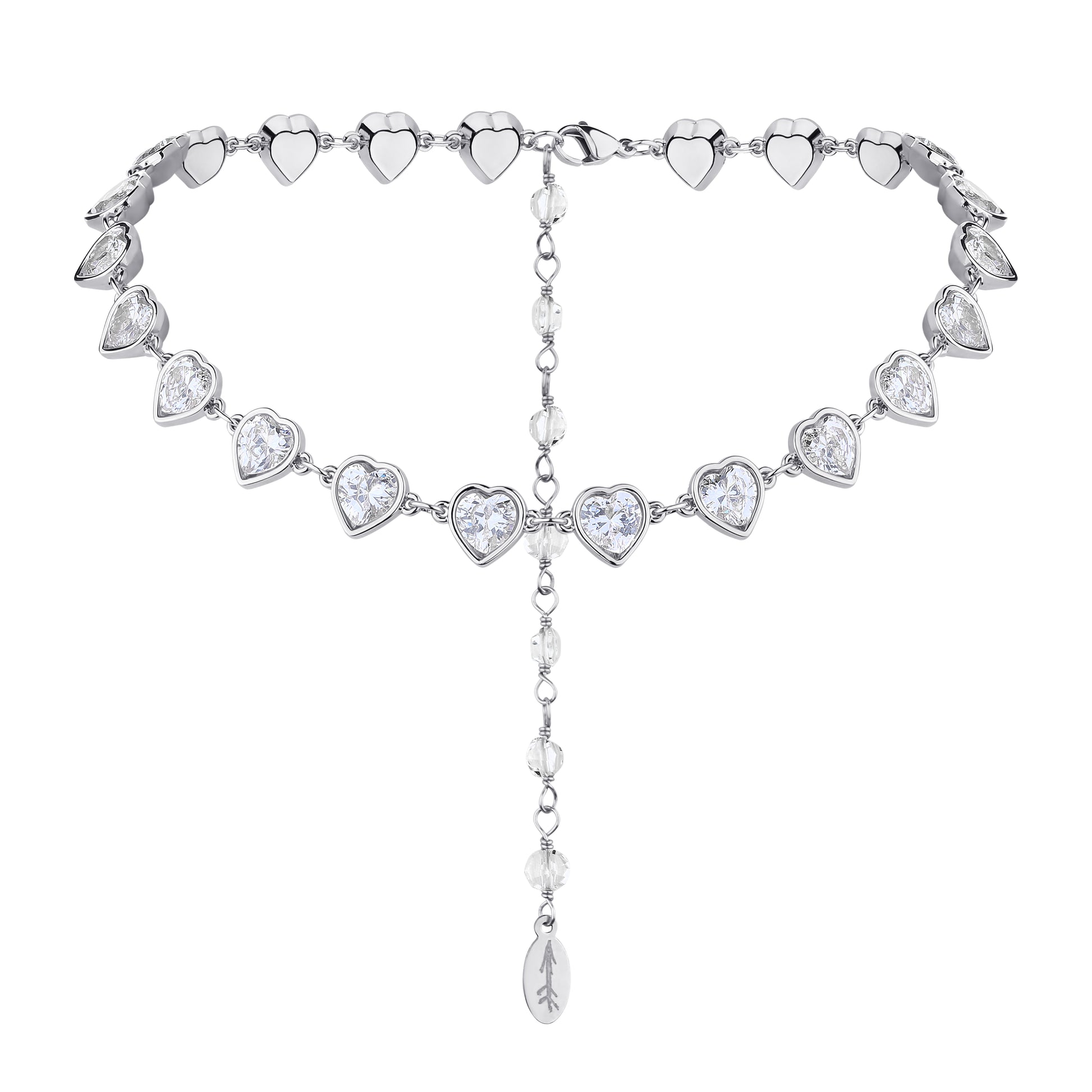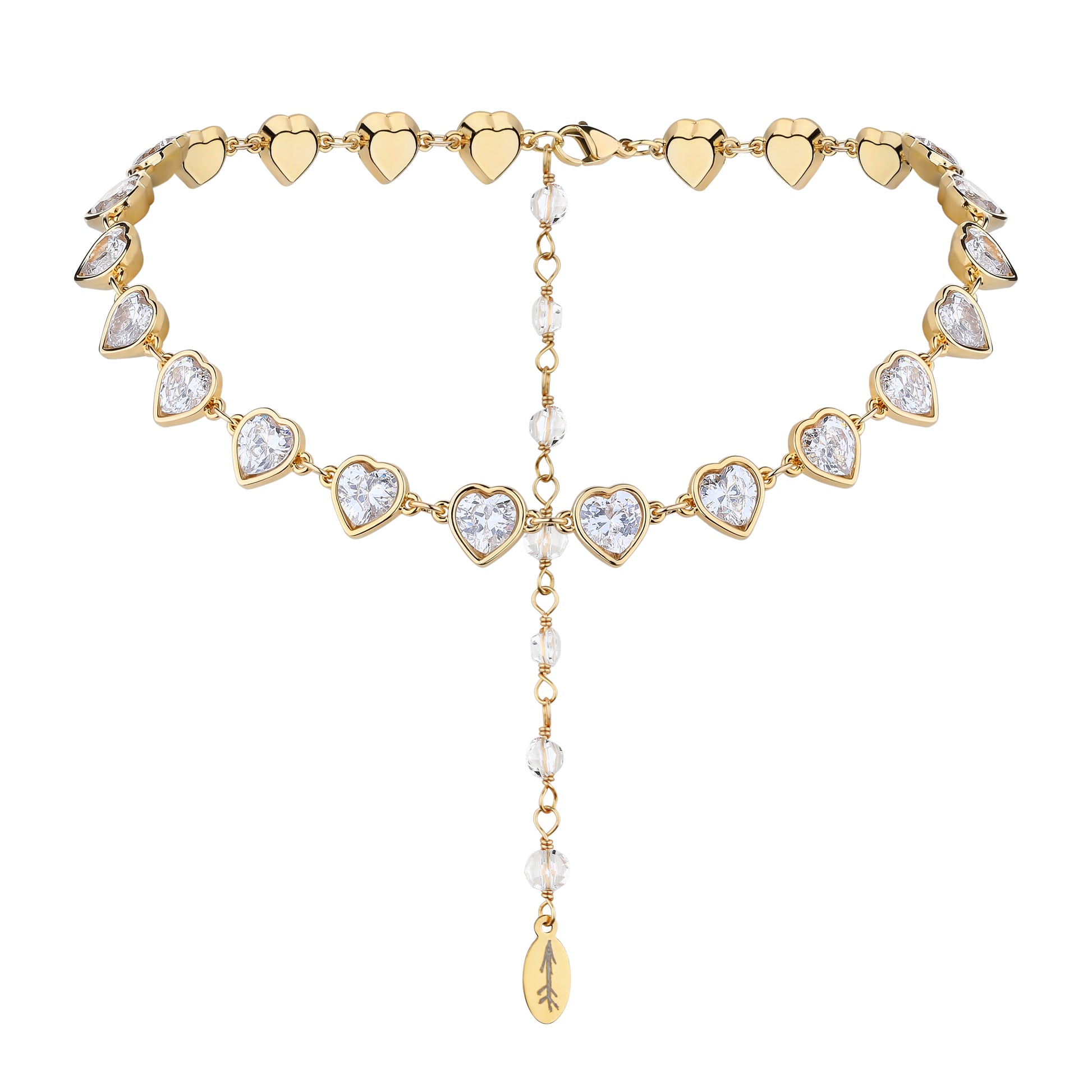 Choker made from rhodium or 24k golden plated brass with cristal hearts.