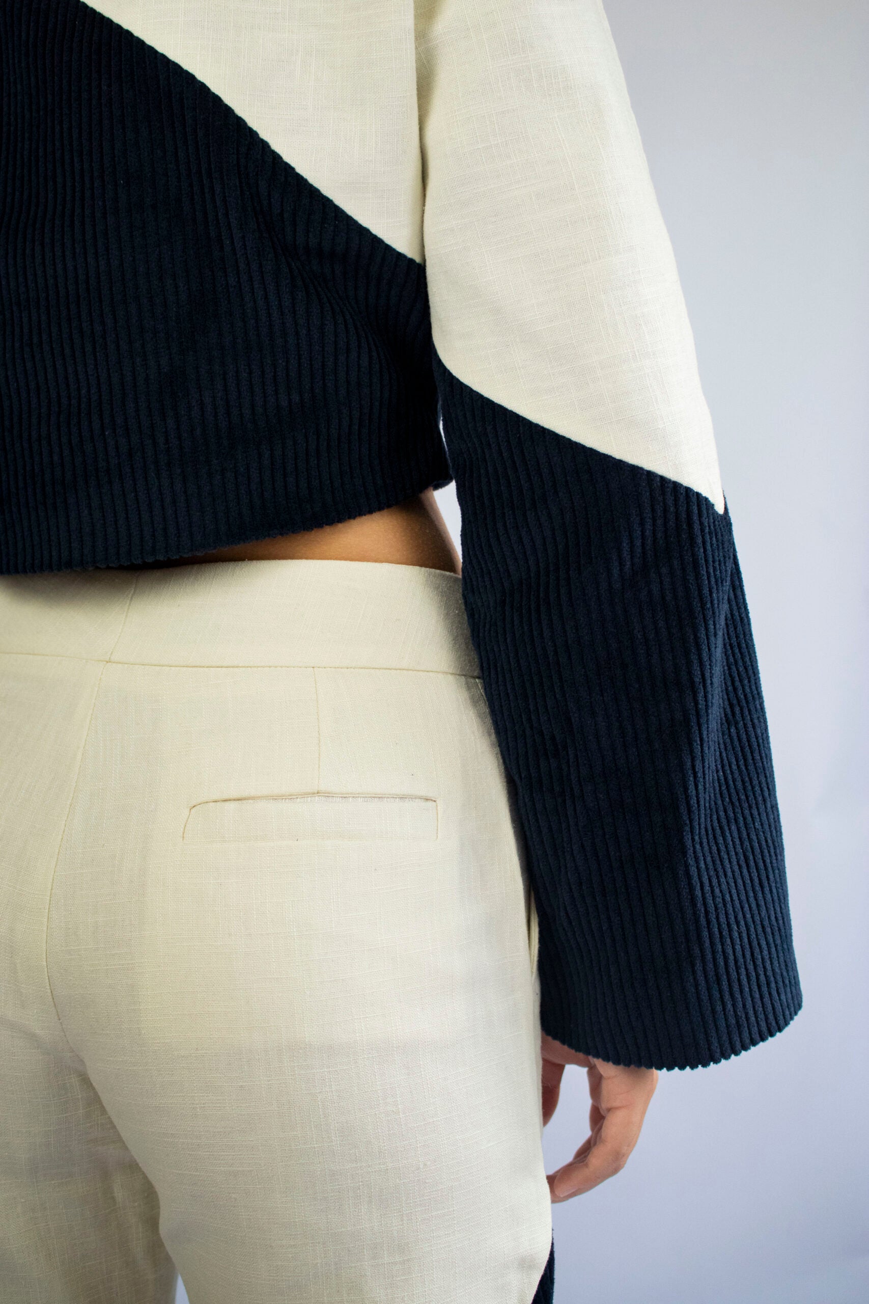 Asymmetric jacket bi-material. Made with linen and cotton velvet.