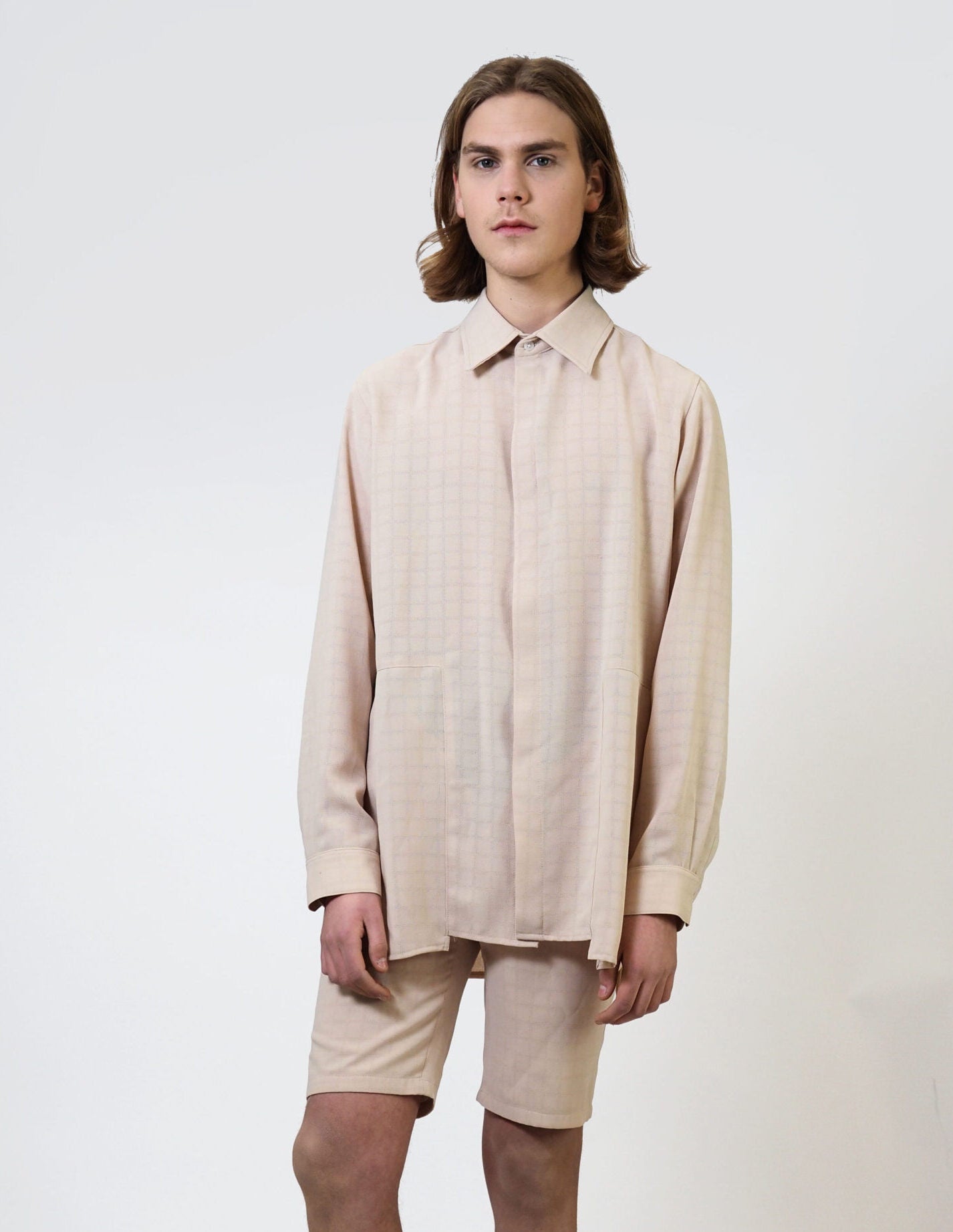 Long-sleeved shirt with yokes. Hidden button placket. Can be matched with the Nile creme Short.