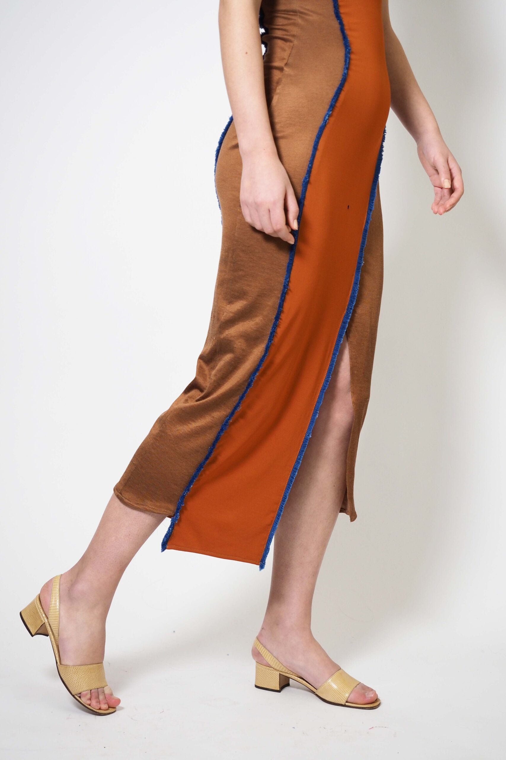 Lightweight assymetrical dress, slit in front, slips on at the bottom. Made with a soft and stretchy material. Orange textile : 10% silk 90% viscose Brown textile : 100% cotton
