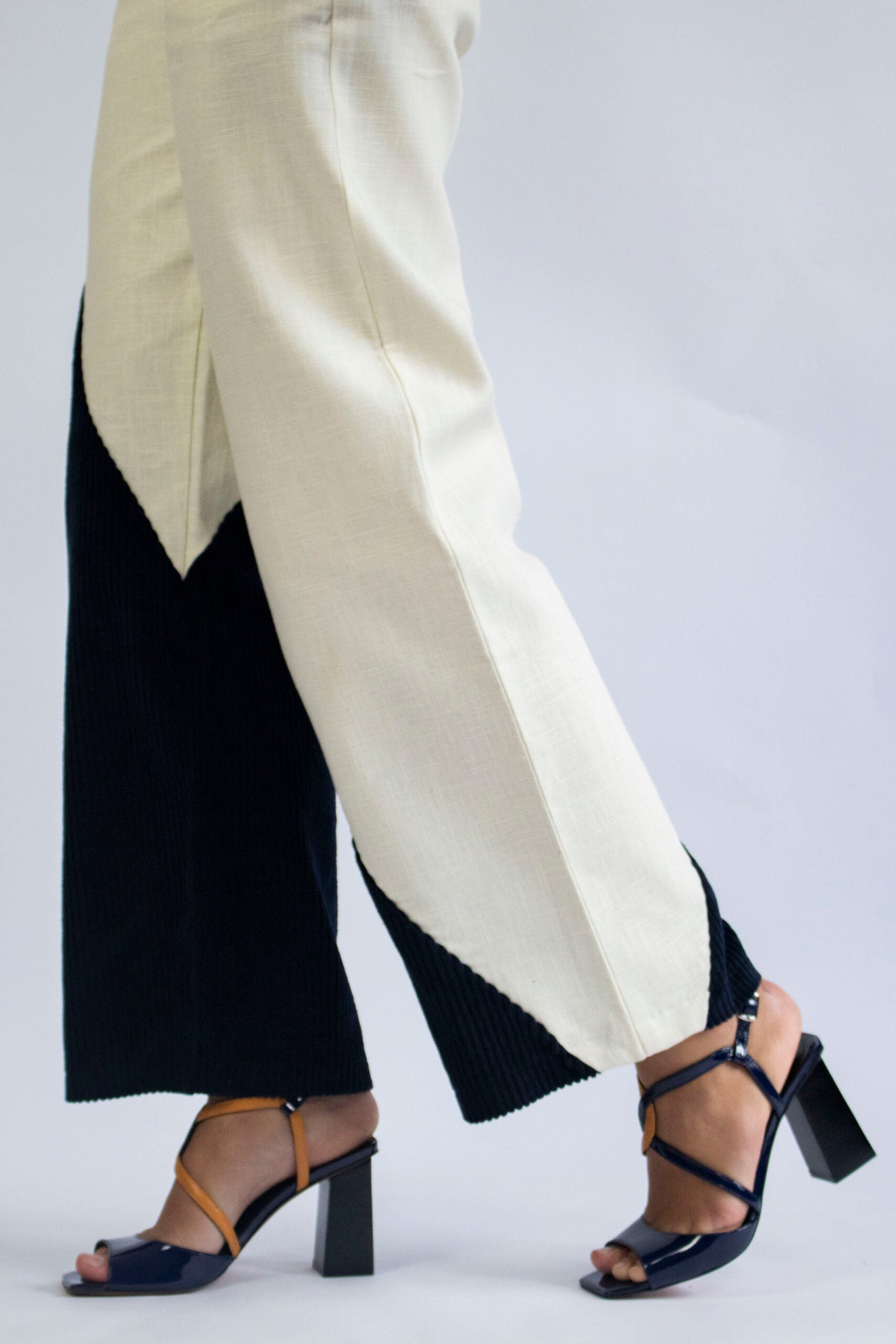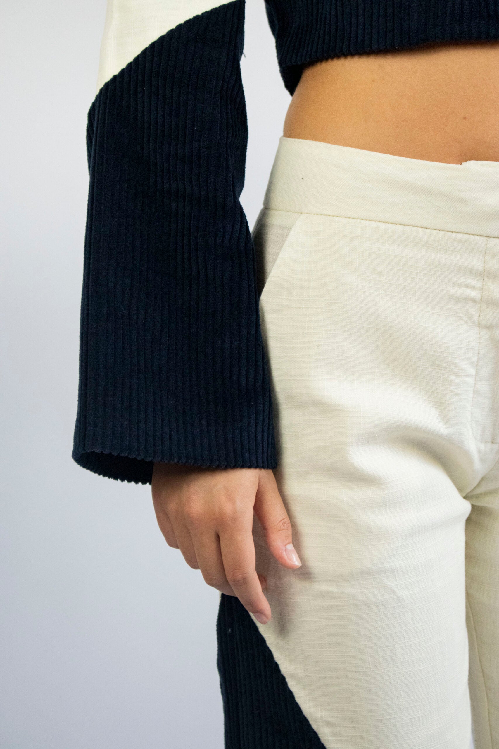 Asymmetric pant bi-material. Made with linen and cotton velvet.