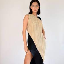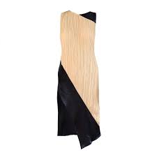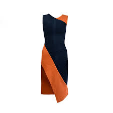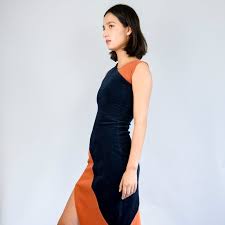 Asymmetric mid-length dress. Beige dress made with up-cycled material (pleated fabric) and silk and cotton (blue part). Terracotta made with cotton velvet (dark blue fabric) and cotton rib knit (orange fabric). Slit on the right side, ideal for both daytime and evening occasions.