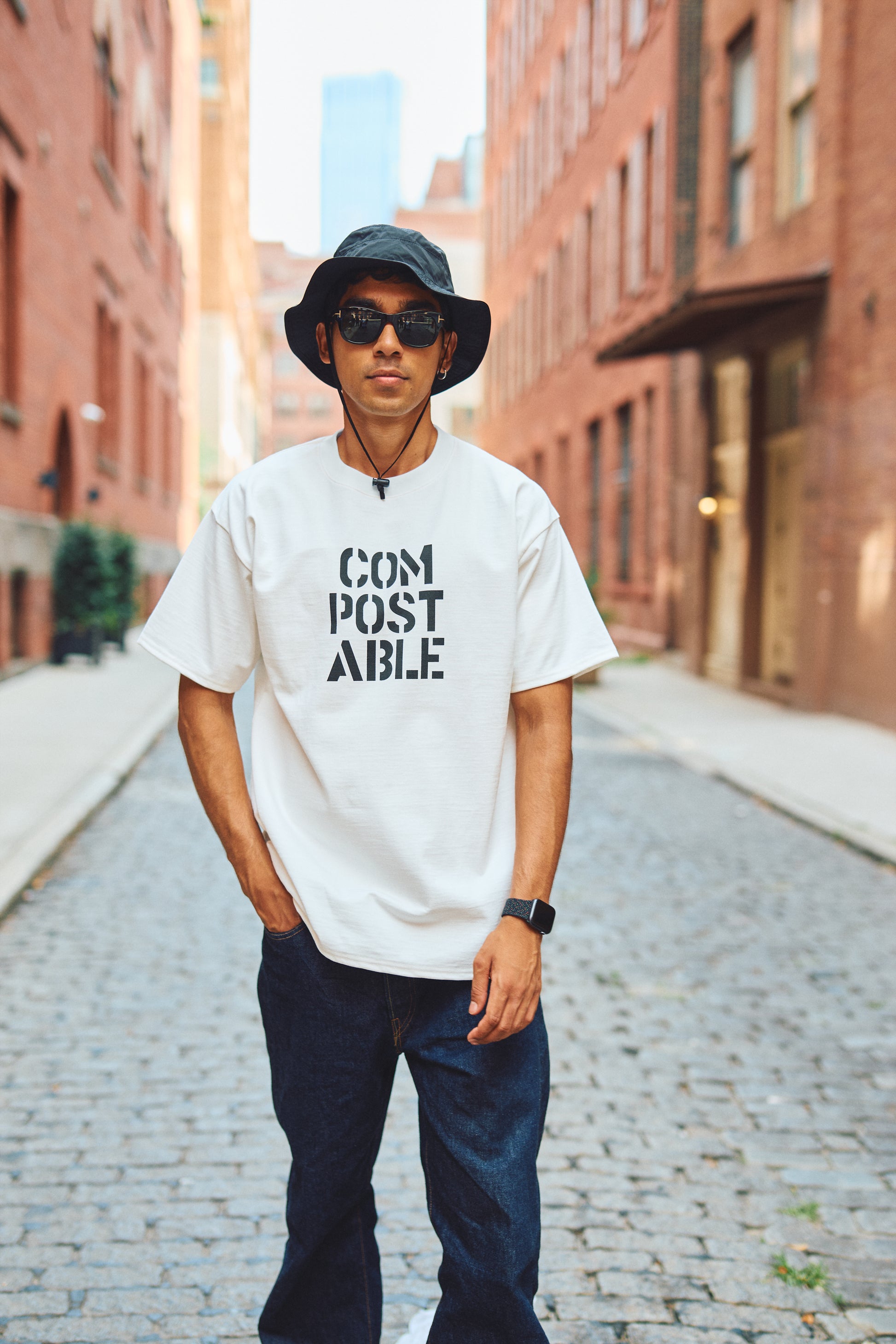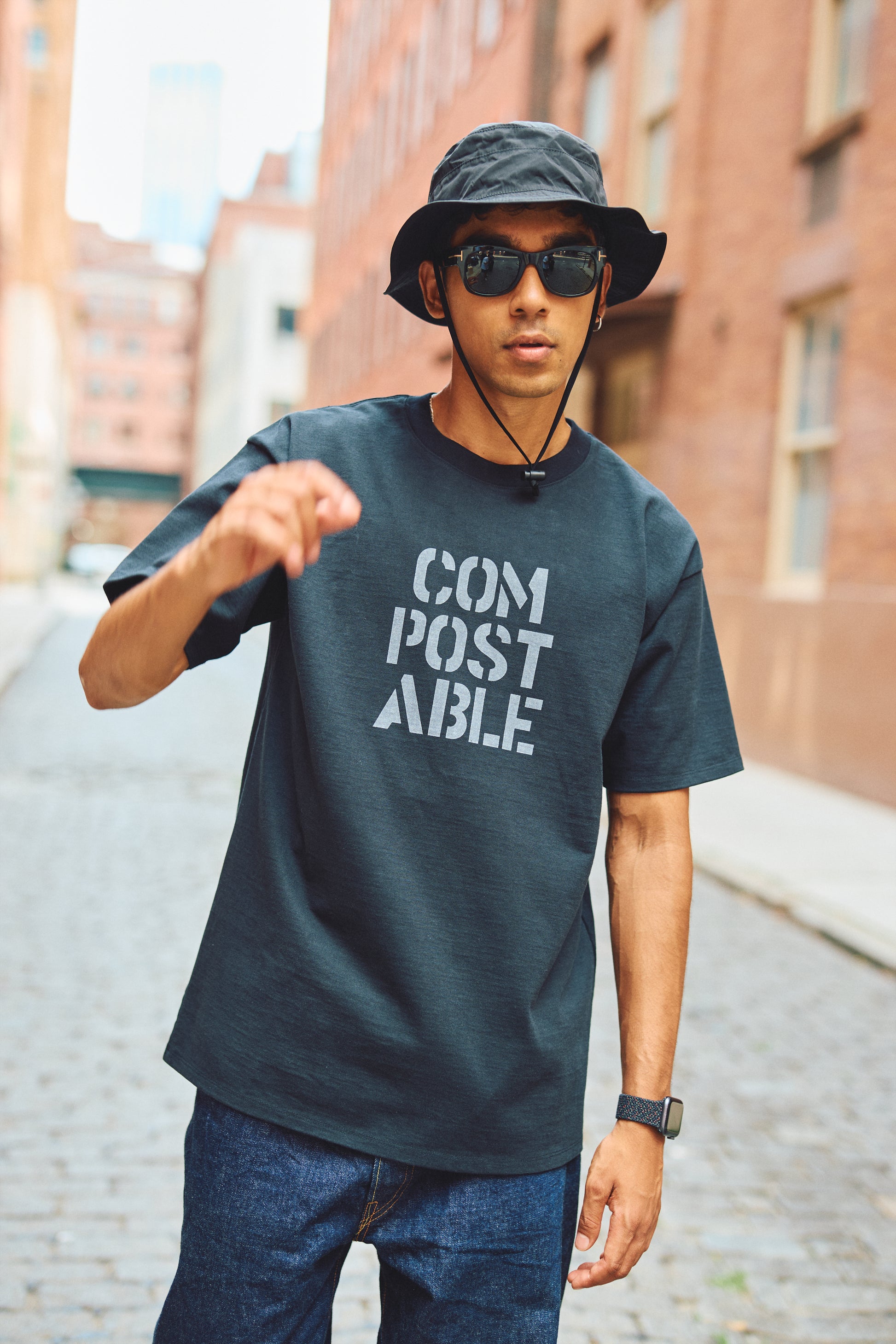 The COMPOSTABLE TEE adopts a font inspired by industrial stencil techniques, expressing a rugged and powerful industrial aesthetic.