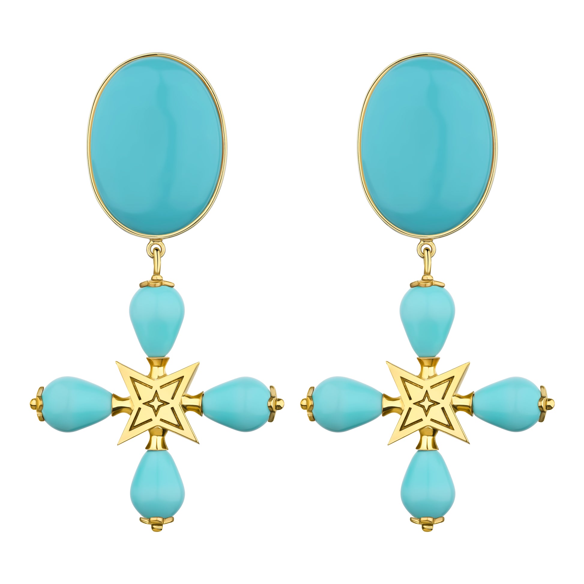 Made of 24-karat gold-plated brass and turquoise stones, a cross made of ceramic beads. Nickel-free. Length: 8 cm. Weight: 19 g (one earring)