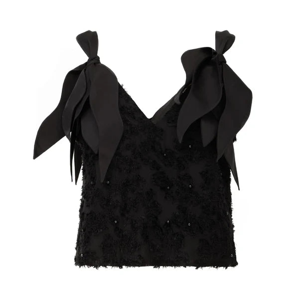 Introducing our latest creation: the embodiment of elegance and charm. Crafted from sumptuous fabric, this top features a captivating V-neck design that effortlessly elevates your neckline with sophisticated allure. The sleeveless silhouette is adorned with delicate tie details at the straps, infusing a hint of femininity and grace. Tailored to complement your figure, it boasts a sleek and flattering silhouette. With its chic shoulder tie design, this top is sure to turn heads wherever you go. The enticing V-neckline at both the front and back adds an extra layer of allure to this standout piece. Elevate your style with this exquisite top today!