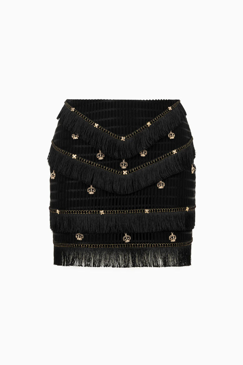 The Echo Set features a sleek, dark fabric layered with various textures to create a distinctive, multidimensional look. Metallic tuft details catch the light with a subtle shimmer, adding depth and complexity. The structured crop top and fitted skirt come together in a streamlined silhouette that resonates with quiet confidence, like an understated echo of elegance that lingers.