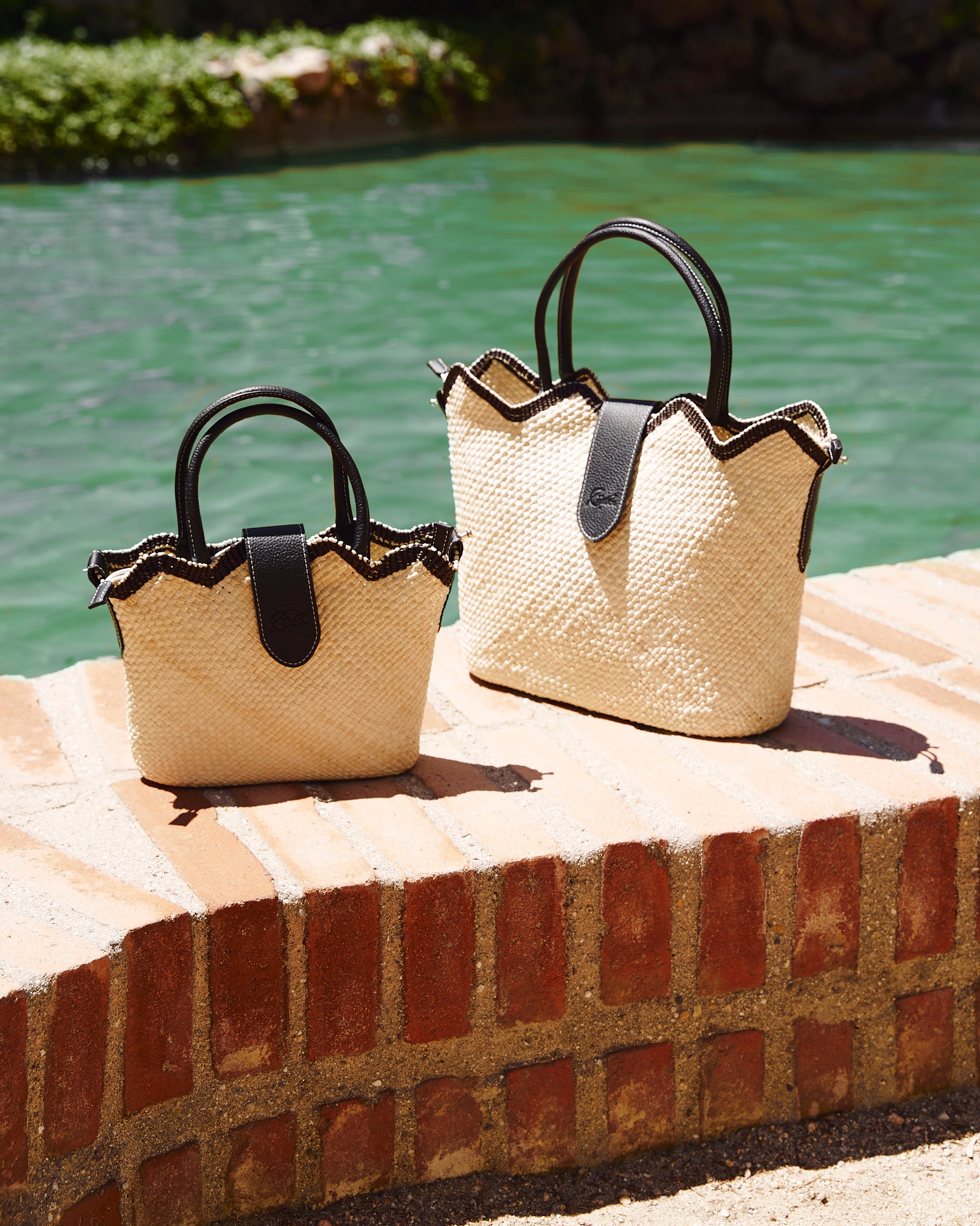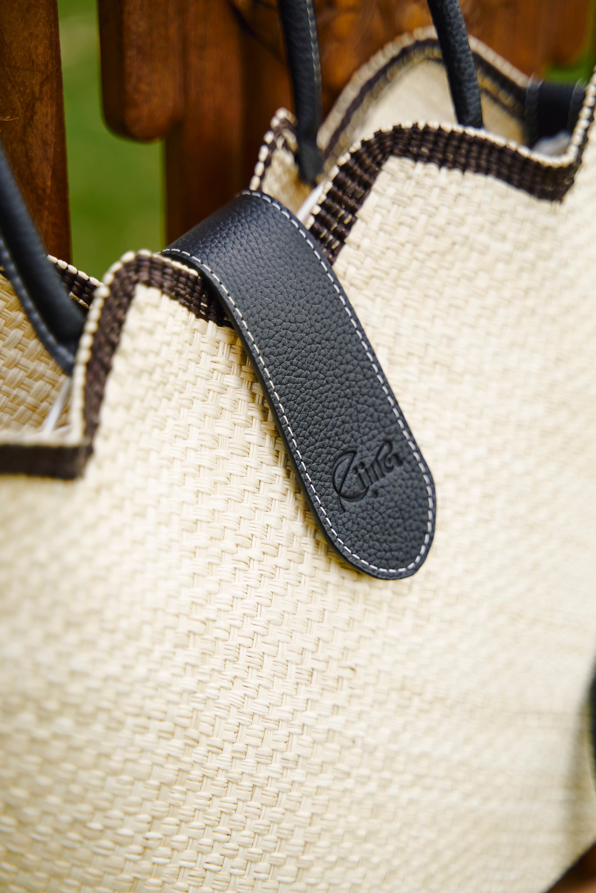 Ivory white carrycot bag, medium size, made out of iraca palm (harvested, transformed and dyed traditionally by peasant women from Sandona Colombia) with hand strap and adjustable shoulder strap in 100% cowhide leather (natural leather from Ubrique Spain).