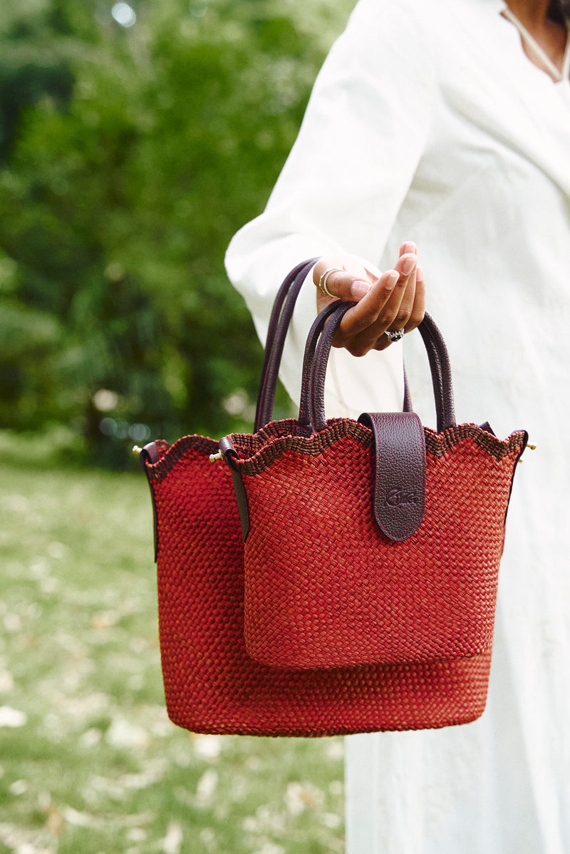 Ivory white carrycot bag, small size, made out of iraca palm (harvested, transformed and dyed traditionally by peasant women from Sandona Colombia) with hand strap and adjustable shoulder strap in 100% cowhide leather (natural leather from Ubrique Spain).