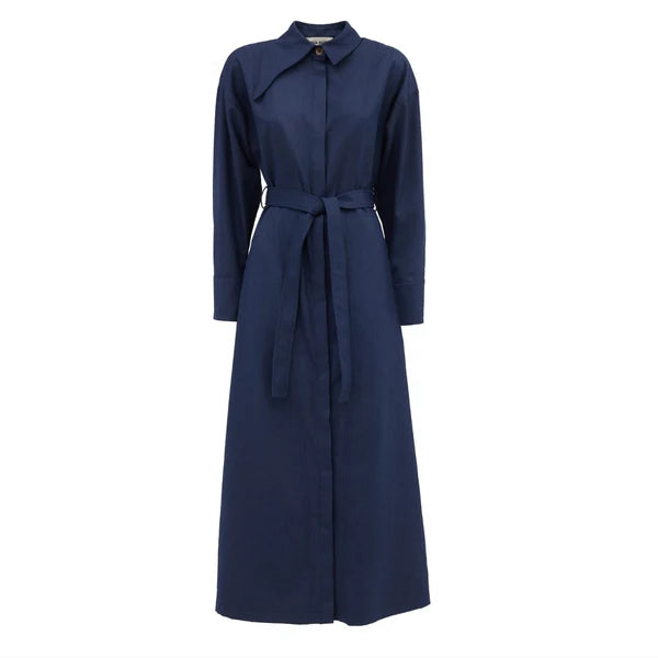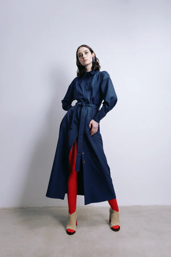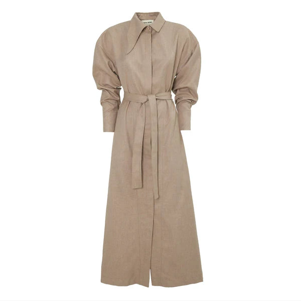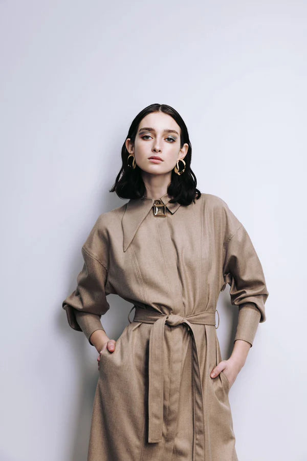 Presenting an exquisite ankle-length dress shirt, meticulously crafted from a medium-density wool-blend fabric that offers both softness and comfort to the touch. This material is an excellent selection for the cooler seasons, providing warmth and comfort without compromising style. The dress's elegant length gracefully sweeps down to the ankles, portraying a sophisticated and feminine allure. A contemporary touch is added with the fashion-forward dropped shoulder seam, lending the dress a modern and stylish appearance while maintaining a sense of relaxed elegance.