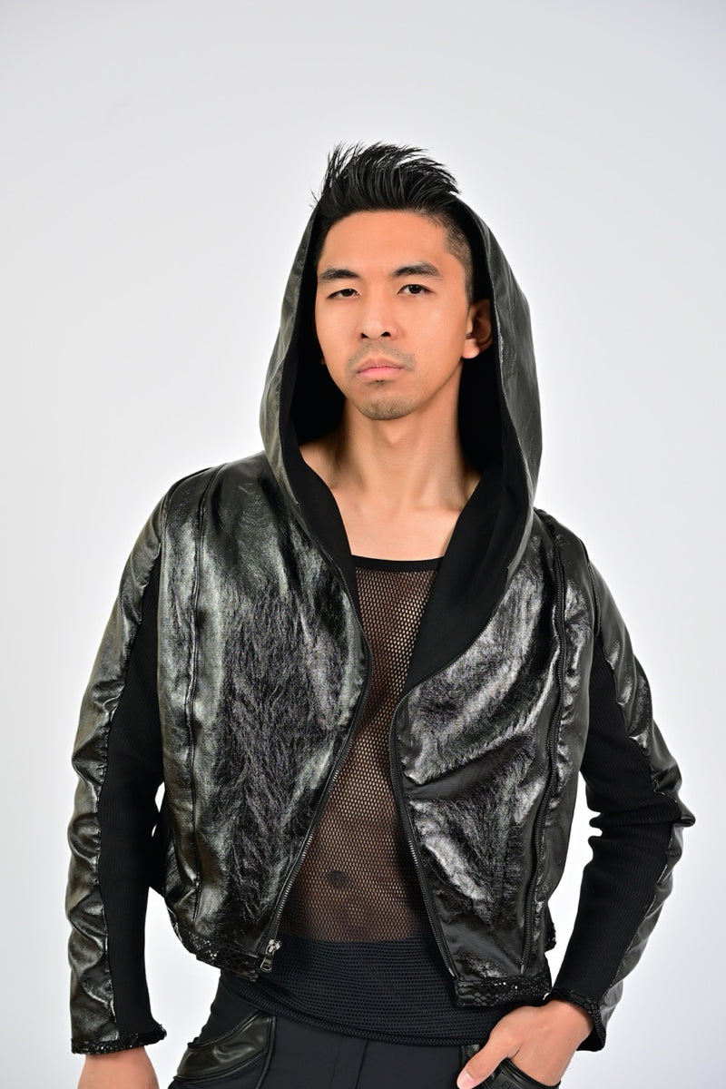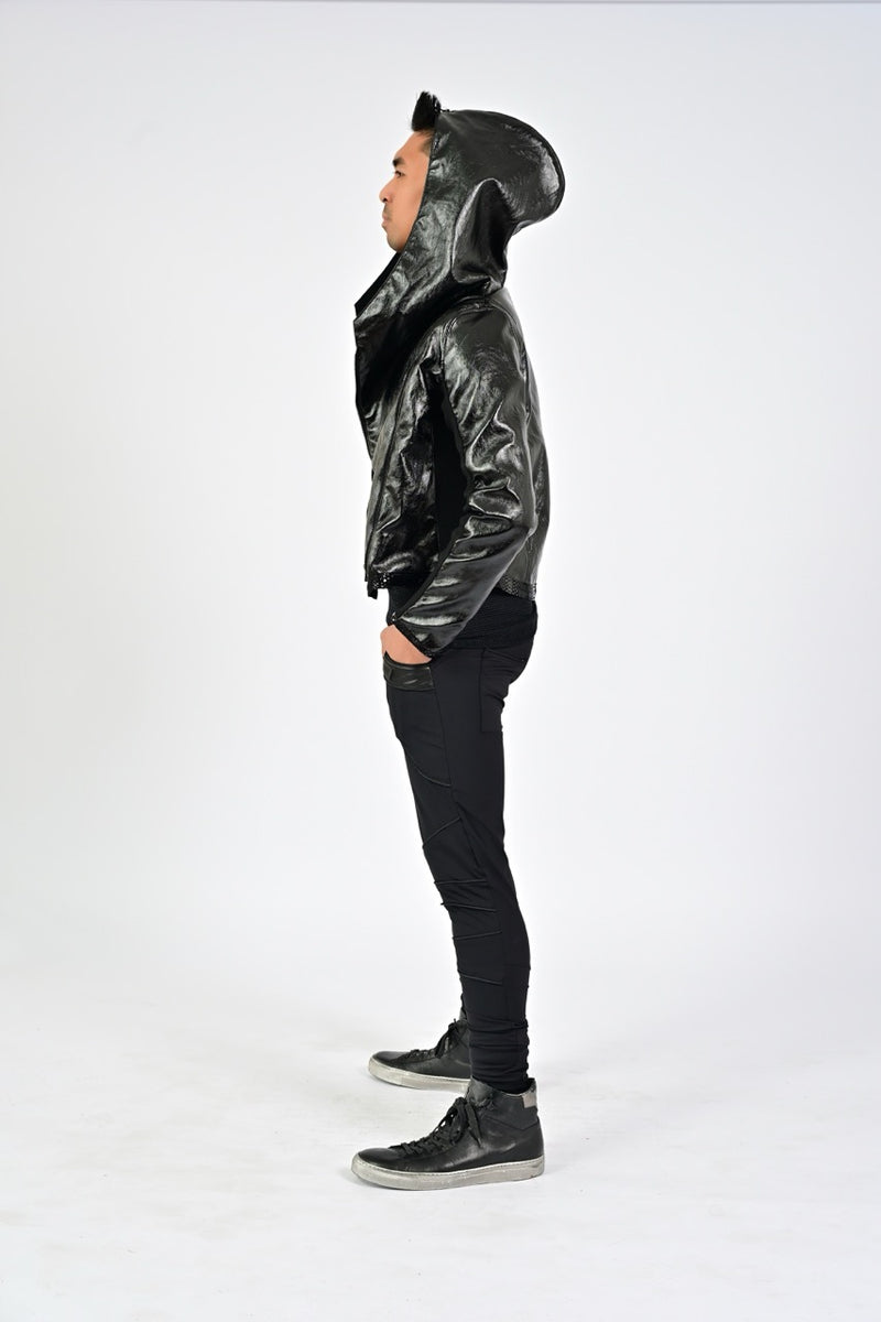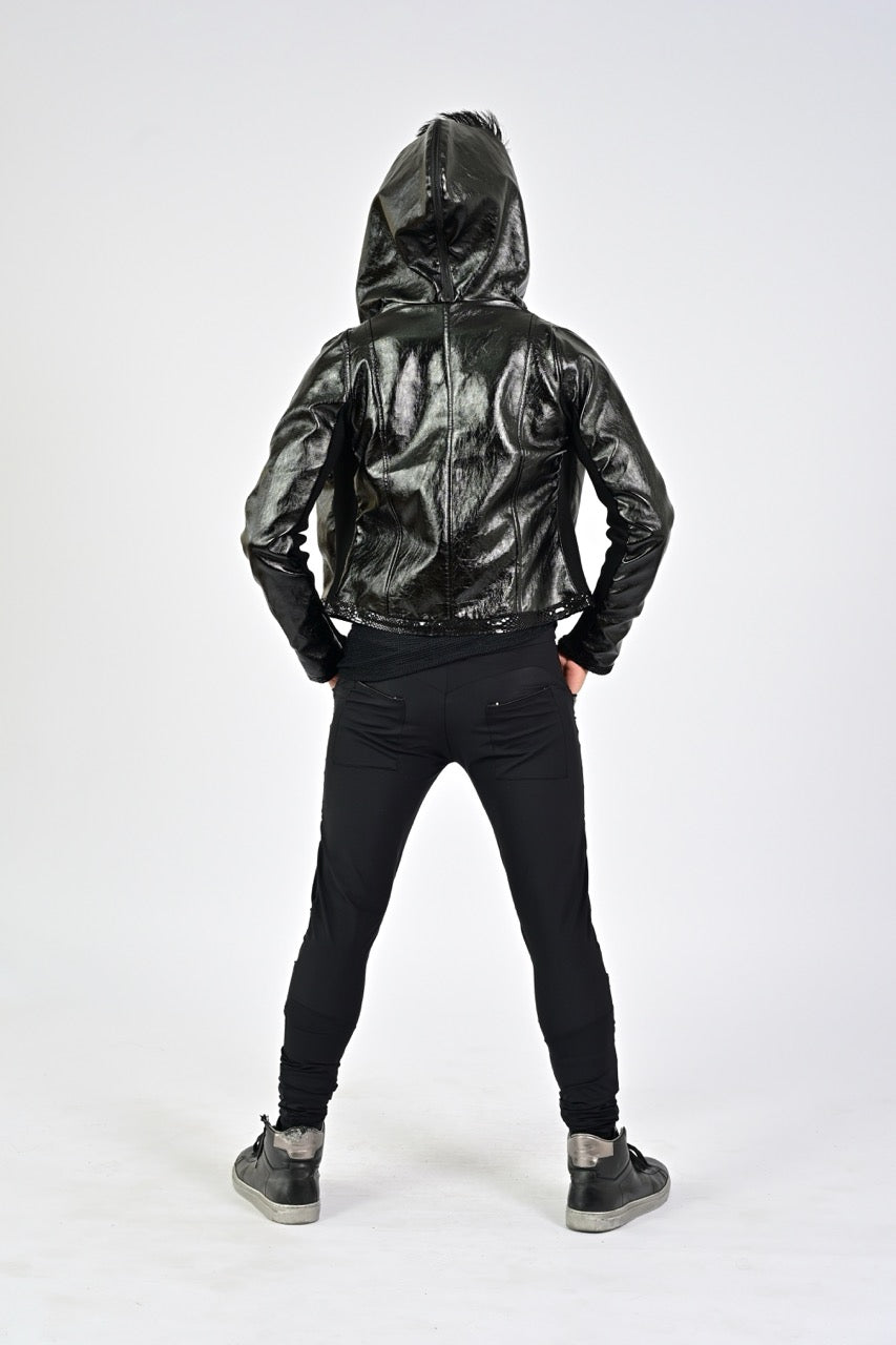 Zip Hoody Biker style wrap coat with dual zippers & stamped snake trimming. Sleek sexy and fitted. Made with Cotton Shiny foiled denim. Corset seams down back and stretch panels on sides under sleeves for movement. Made in New York City.