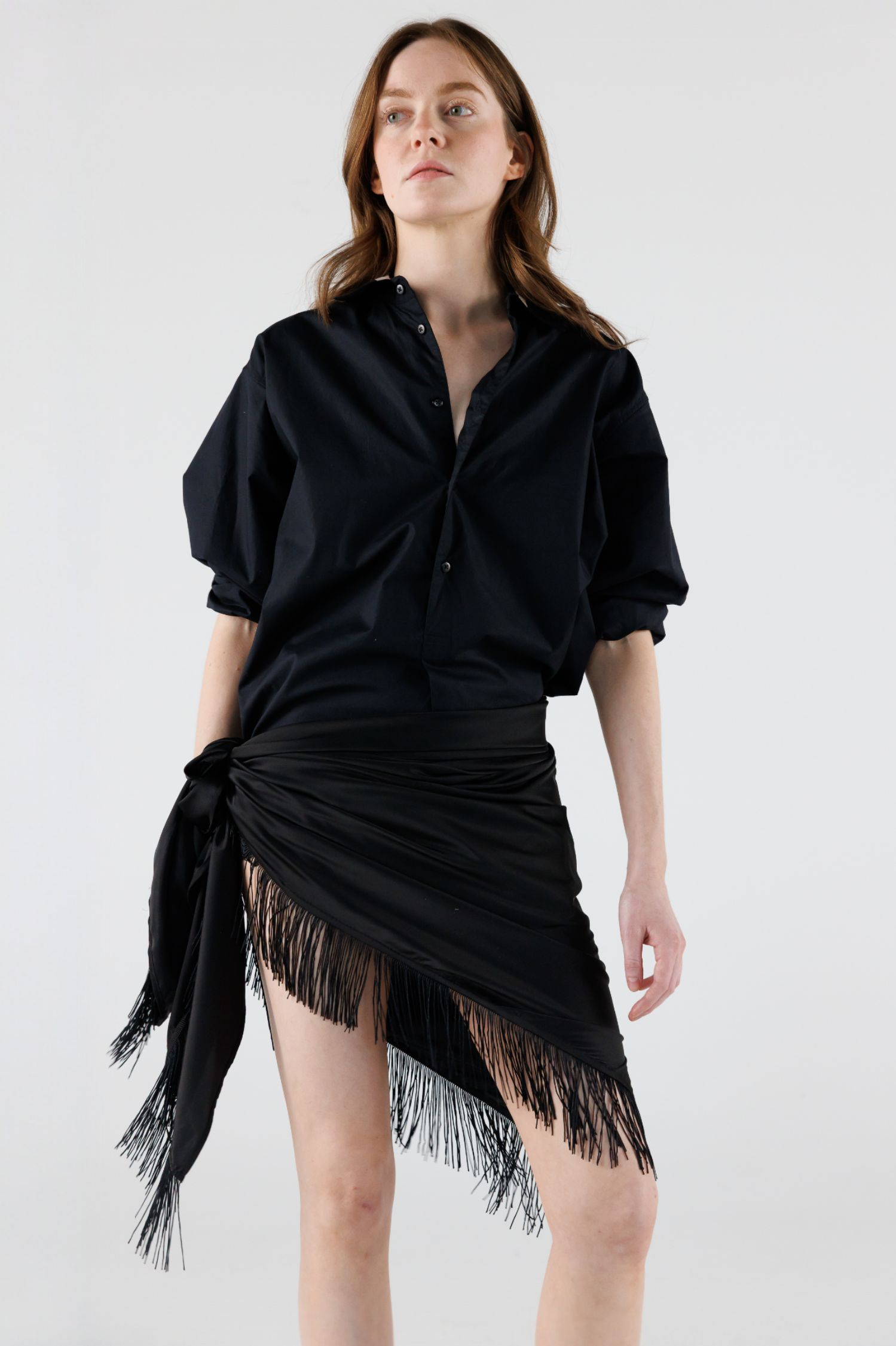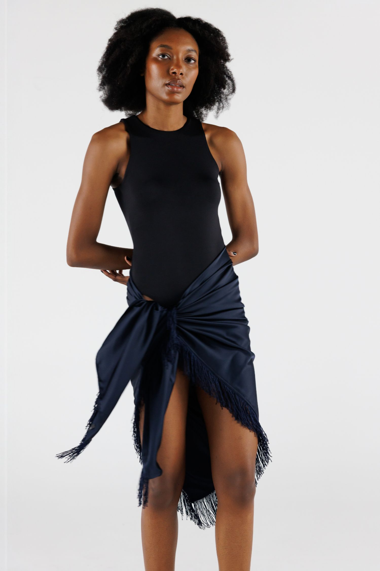 46Ó square wrap scarf in deadstock crepe de chine, with fringed edge trim on 2 sides. Worn as a wrap, pareo or wrap top. Feels like silk.