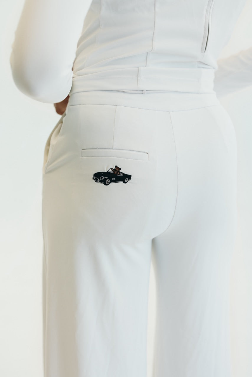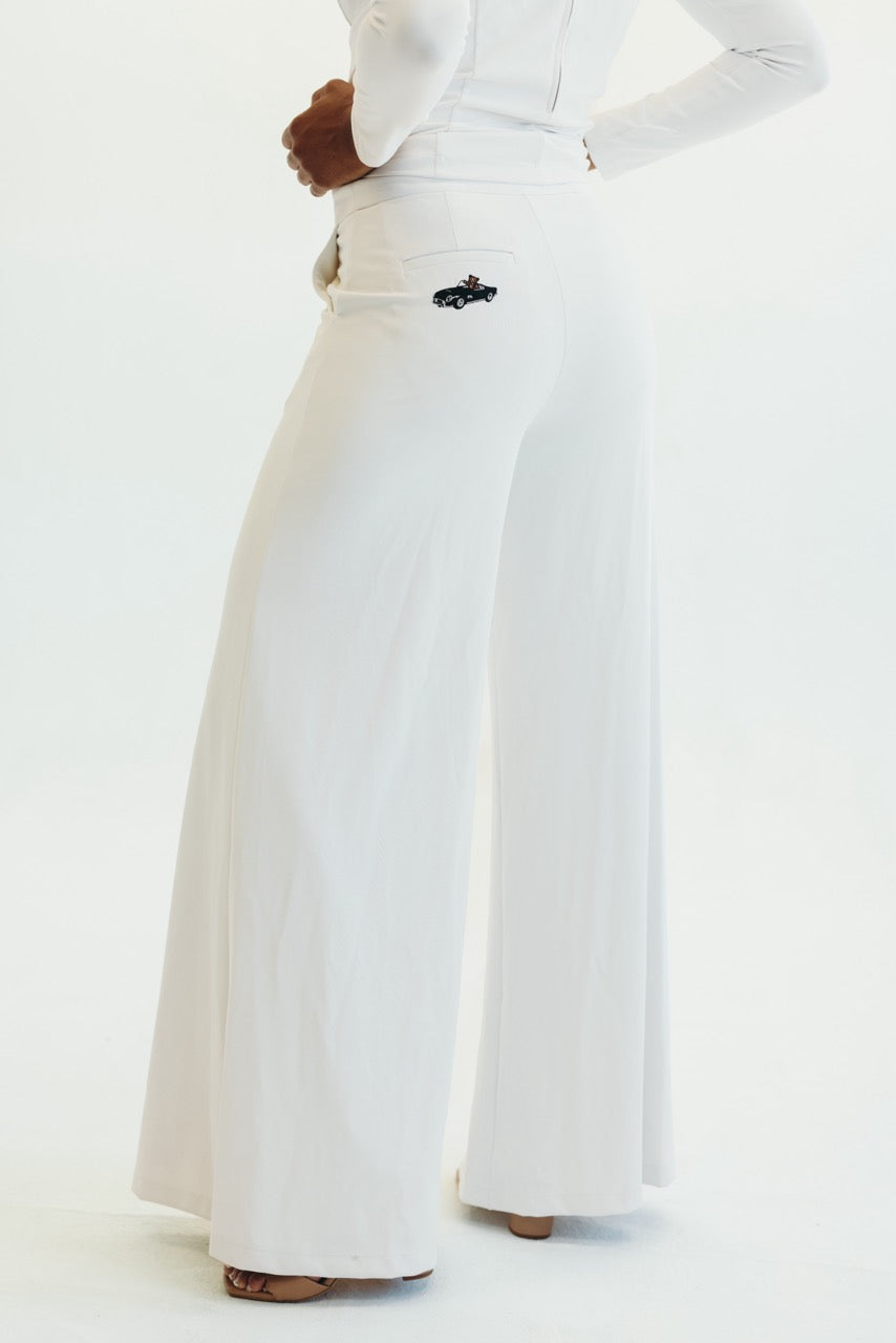 Flowy, straight leg pants hit high on the waist. The lustrous fabric stretches and hugs the body without giving any feelings of constriction.