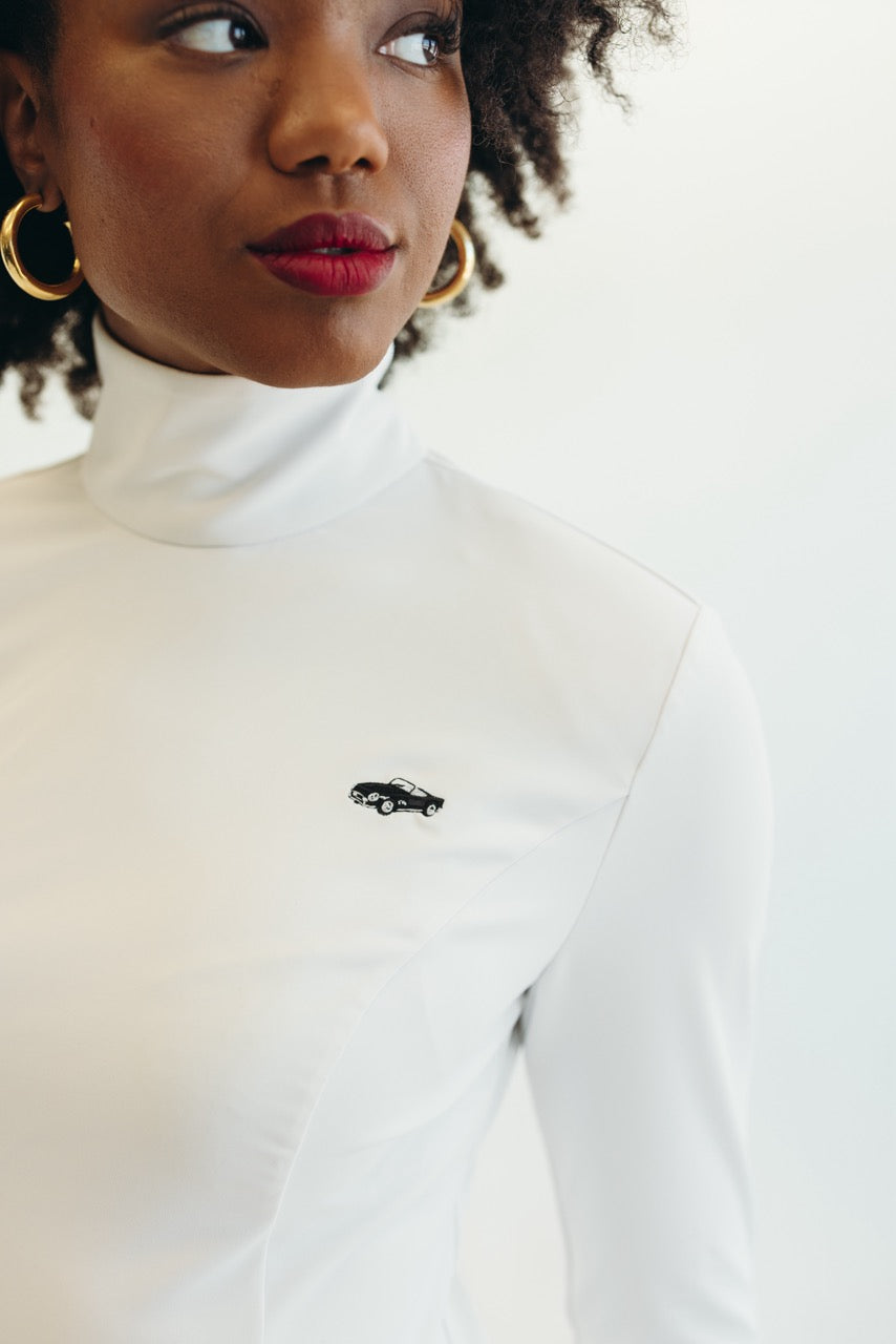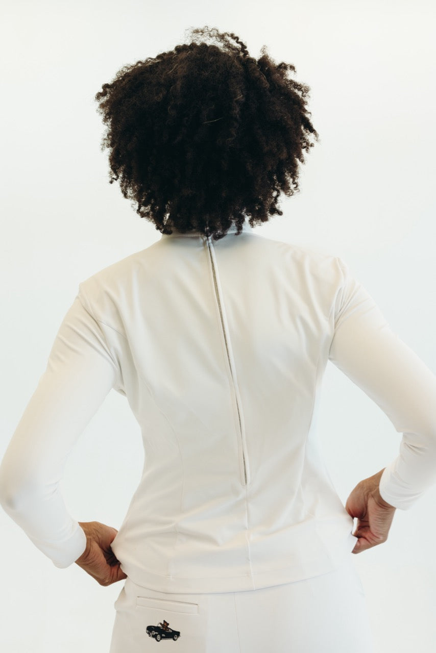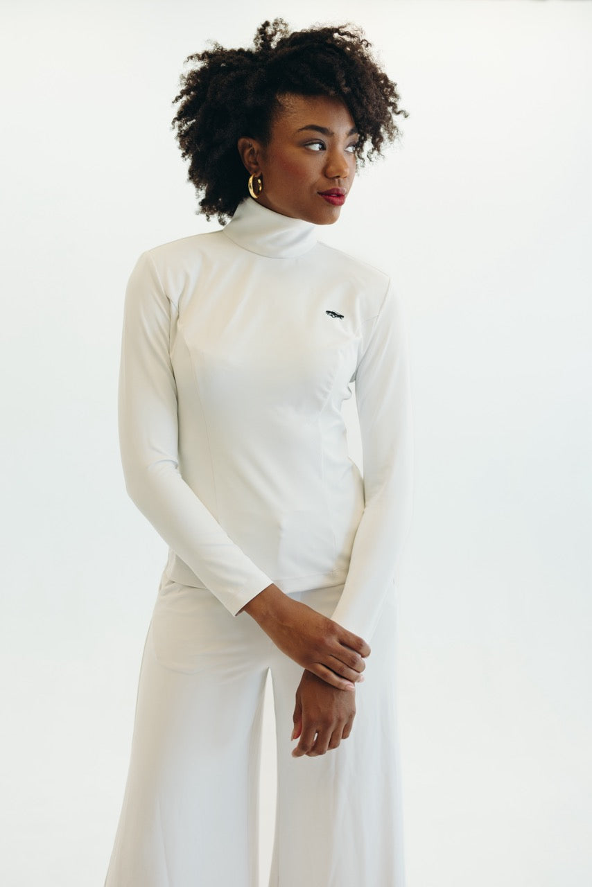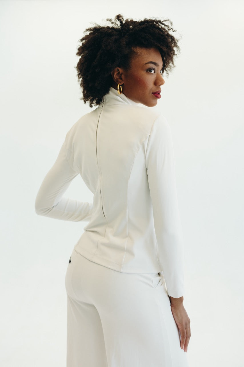 Fitted through the arms and chest, with a defined waist. Below the waist the top falls loosely covering the butt. Mock Neck.