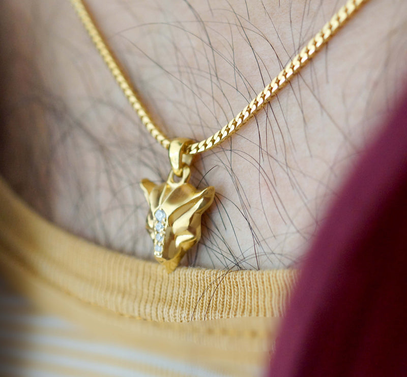 The FEROX Pendant is a subtle yet bold piece, designed for those who appreciate clean lines and modern elegance. Made in New York, crafted from sterling silver and plated with 18k yellow gold, the pendant features a geometric cougar head, carefully shaped to showcase the animal’s fierce spirit through minimalist angles and precise detailing. The pendant is suspended from a 1.3mm Franco chain.