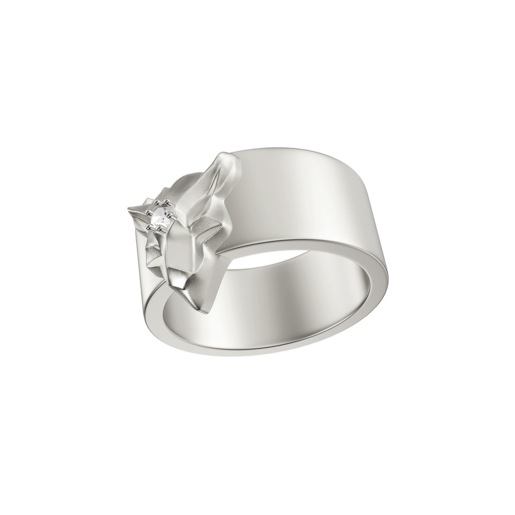 In the heart of the cougar’s face lies a single Moissanite, delicately set between its eyes, adding a touch of sophistication and brilliance to the design. The diamond serves as both a focal point and a symbol of clarity and power, elevating the ring’s bold geometric elements.