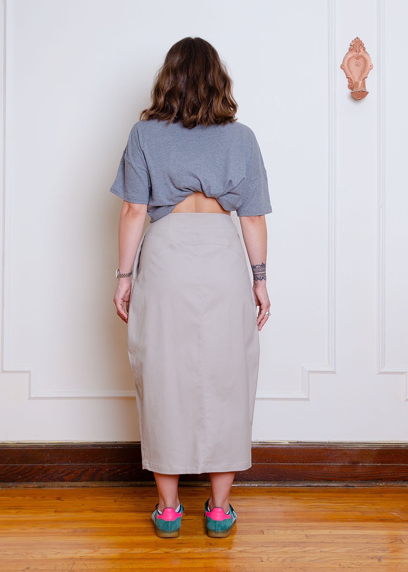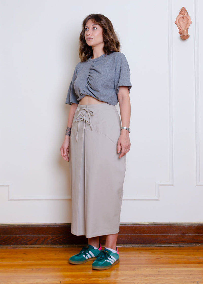 Midi length pull-on skirt with front tie closure, slight parachute silhouette, side seam pockets, centre front pleat detail, waist darts for shaping & curved seam details.