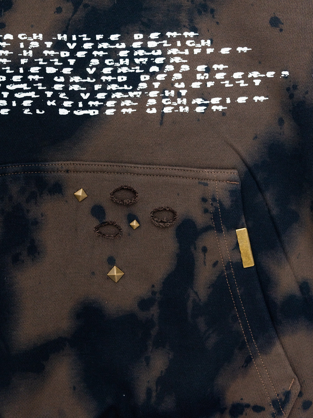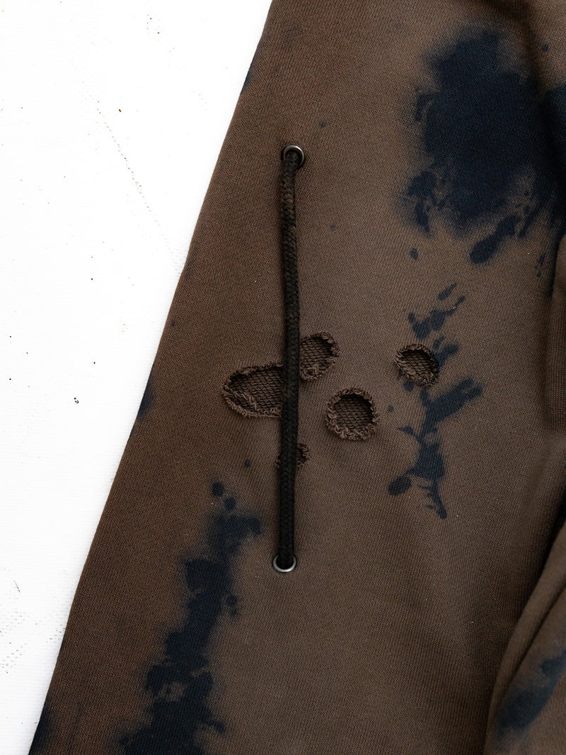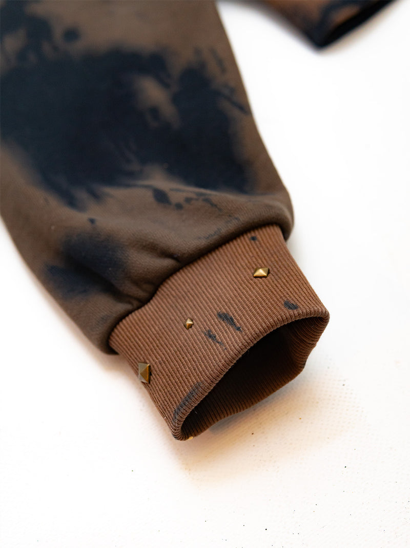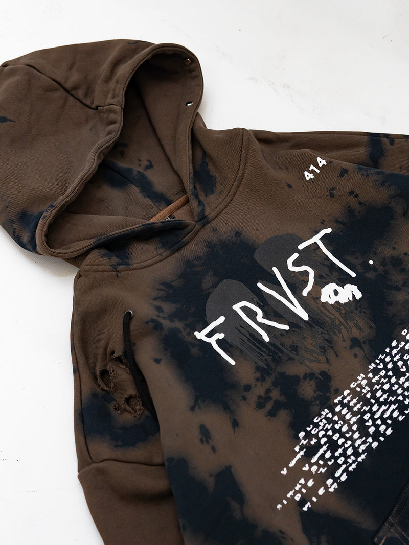Brown Hoodie with a black and white screenprints on the front and back and multiple attachments.