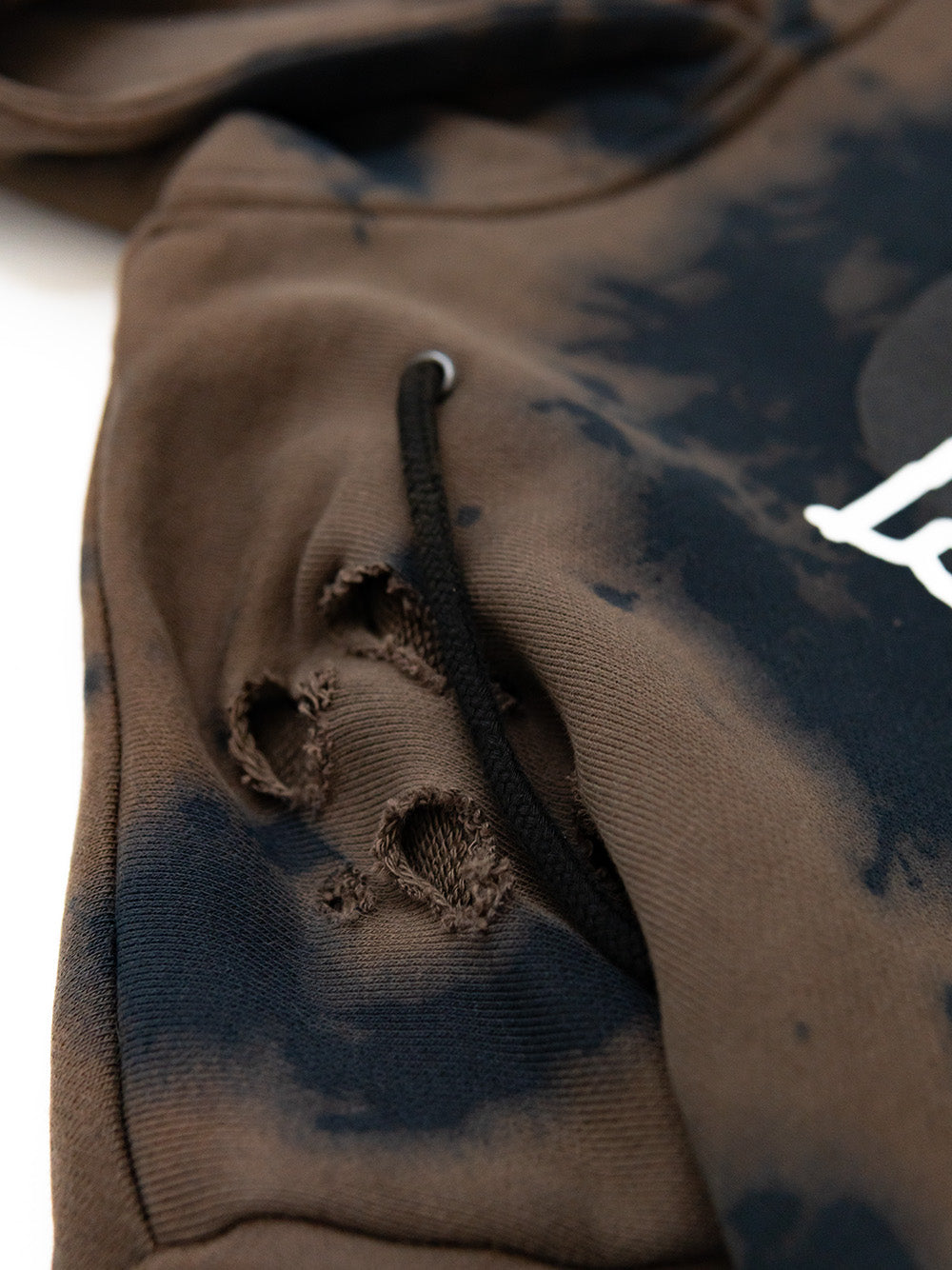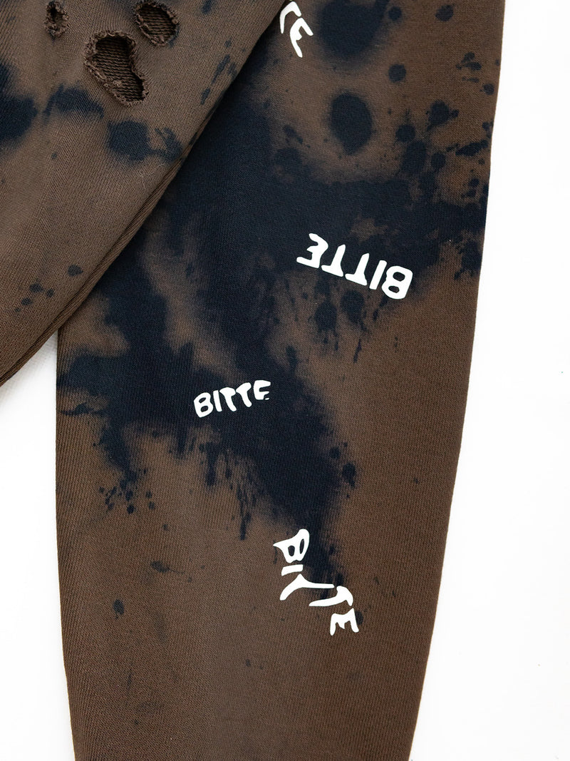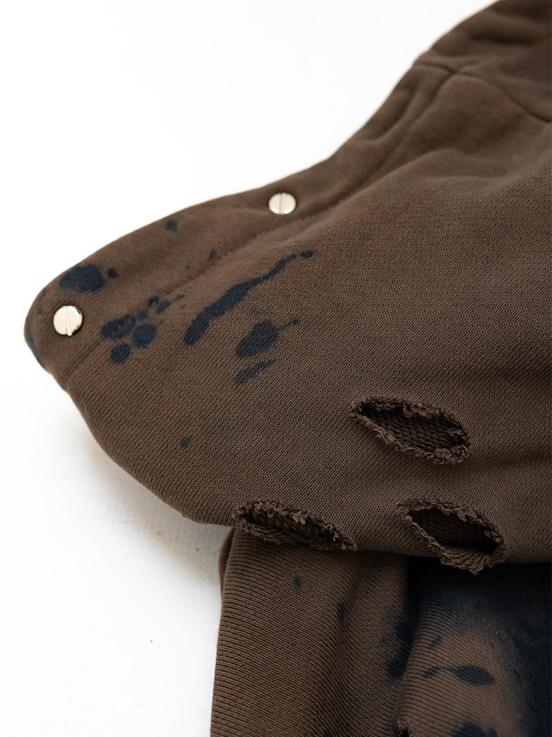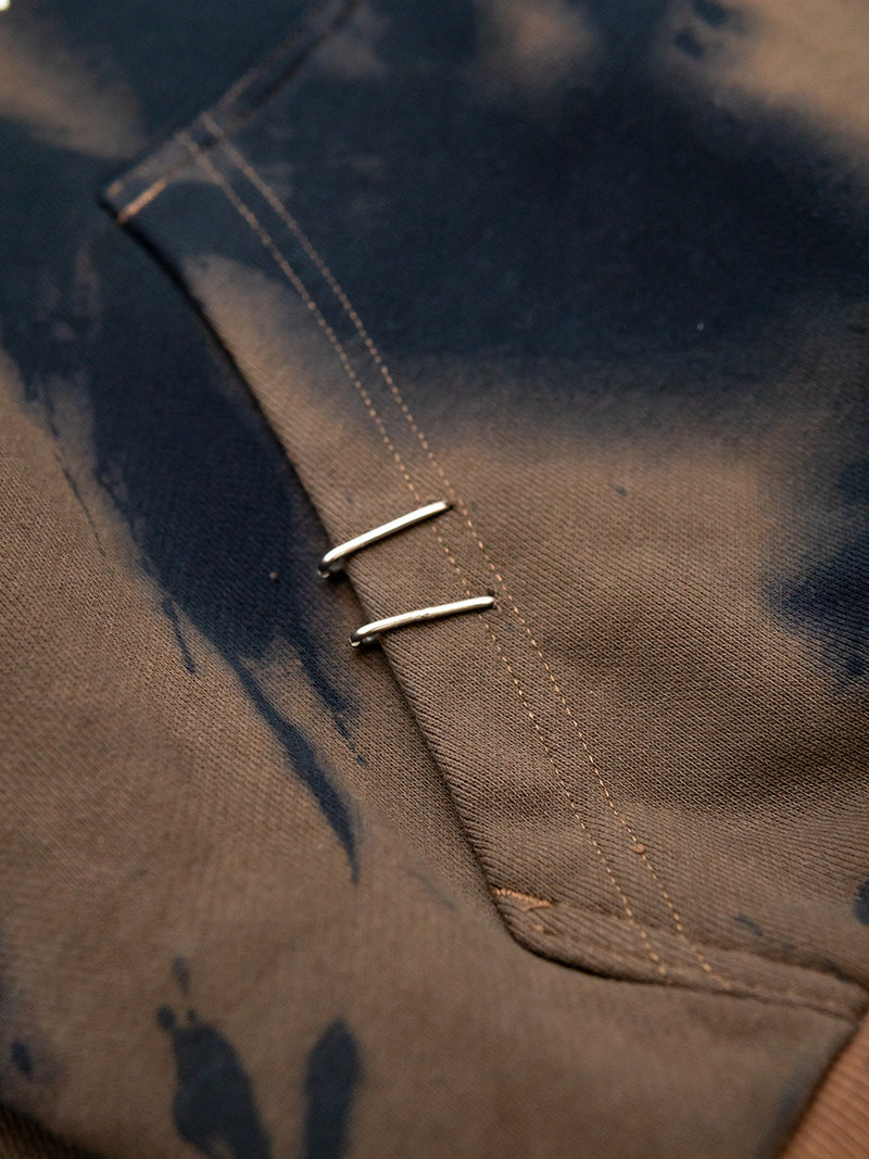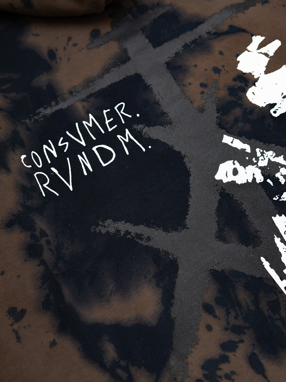 Brown Hoodie with a black and white screenprints on the front and back and multiple attachments.