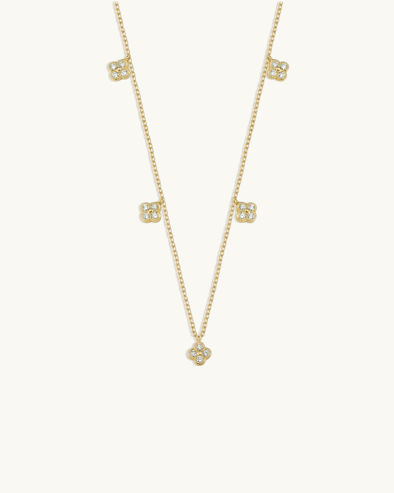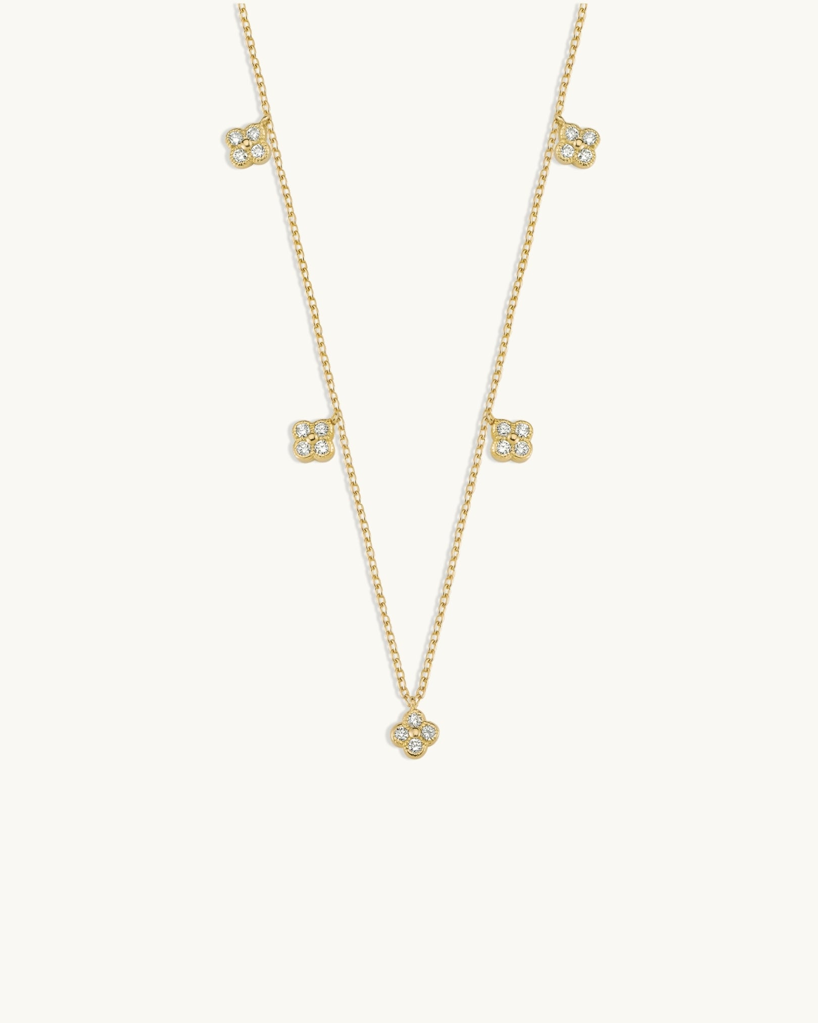 The Gabrielle necklace features five little clover charms dangling along a delicate 14k gold chain, each one set with four round brilliant-cut diamonds for a soft, sparkly touch. Short and sweet - dainty symbols of luck that make a cute gift for a loved one (including yourself!).